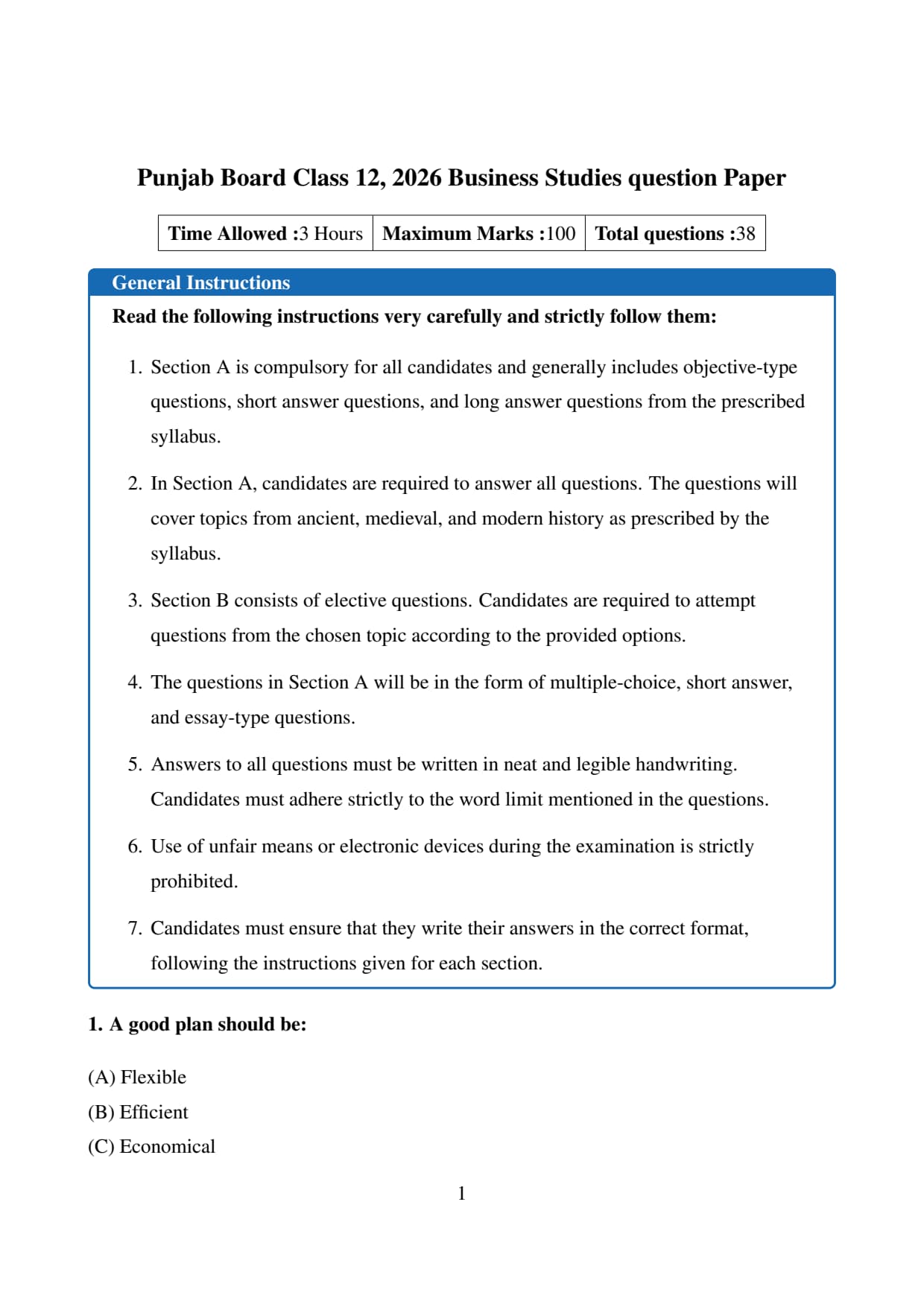 The official question paper of Punjab Board Class 12 Business Studies Board Exam 2026 is provided below. Students can download the official paper in PDF format for reference.