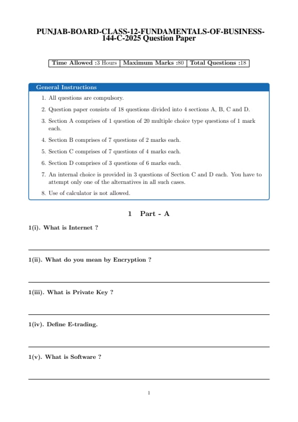 | PSEB Class 12 Fundamentals of Business 2025 Question Paper with Solutions PDF | Download PDF | Check Solutions |
