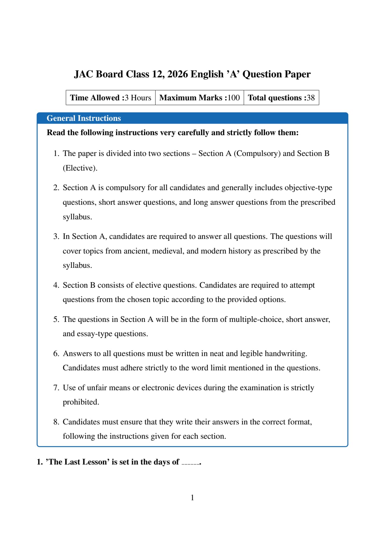 The official question paper of JAC Board Class 12 English ‘A’ Board Exam 2026 is provided below. Students can download the official paper in PDF format for reference.