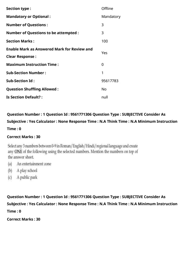 Select any 3 numbers between 0-9 in Roman/English/Hindi/regional language and create any ONE of the following using the selected numbers. Mention the numbers on top of the answer sheet. (a) An entertainment zone