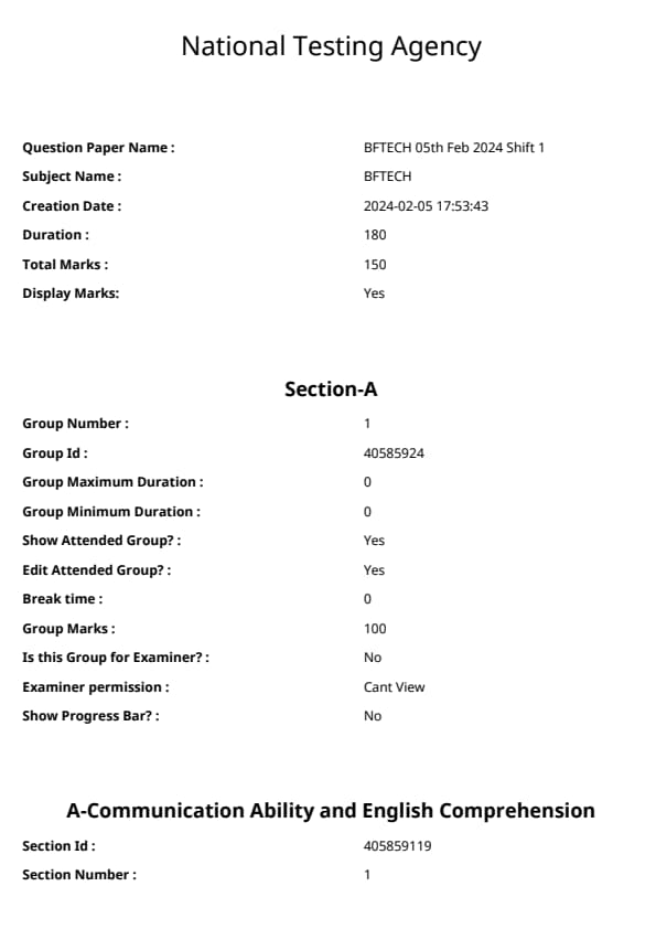 The NIFT 2024 Bachelor of Fashion Technology (BFTech) Entrance Exam is a national-level test conducted by the National Institute of Fashion Technology (NIFT) for admission to its undergraduate design program. The exam assesses candidates on their creativity, analytical thinking, problem-solving ability, and knowledge of design trends.The NIFT 2024 Bachelor of Fashion Technology (BFTech) Entrance Exam has a total of 150 marks and a duration of 3 hours. NIFT Bachelor of Fashion Technology (BFTech) Question Paper With Solution PDF is available here.