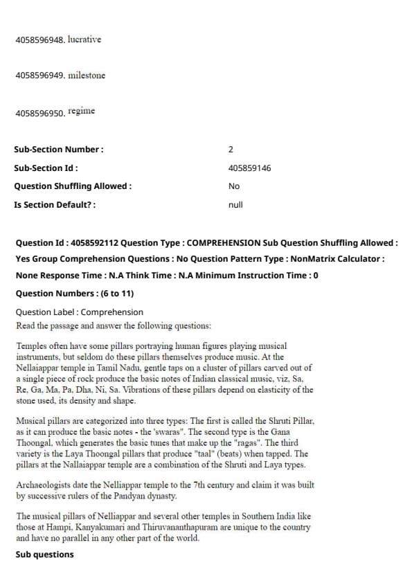 The passage identifies pillars that produce the basic notes of Indian classical music (Sa, Re, Ga, Ma, Pa, Dha, Ni, Sa) as Shruti pillars, which are a type of musical pillar at the temple. Quick Tip: Shruti pillars provide a fascinating example of integrating musical theory into architectural design, reflecting the deep cultural and artistic heritage of the region.
