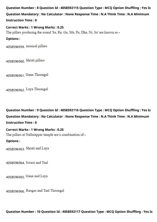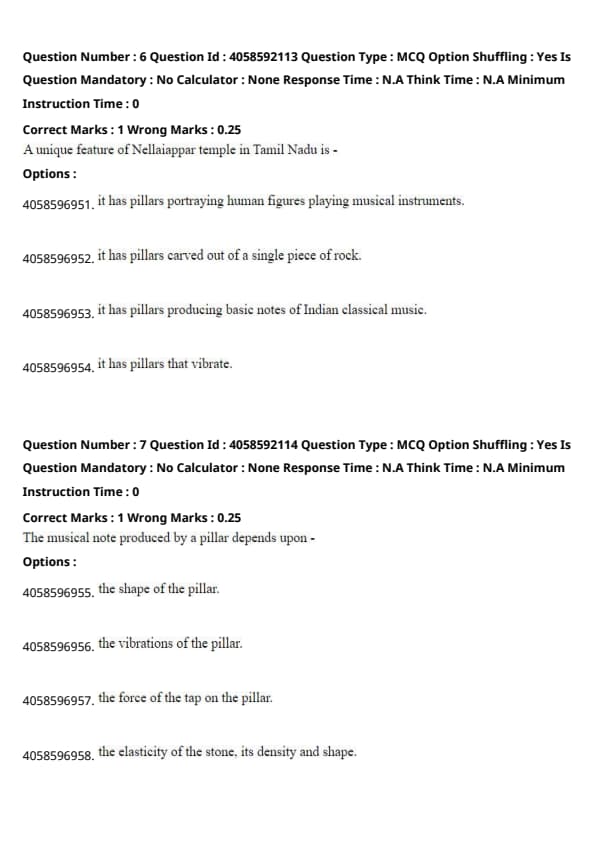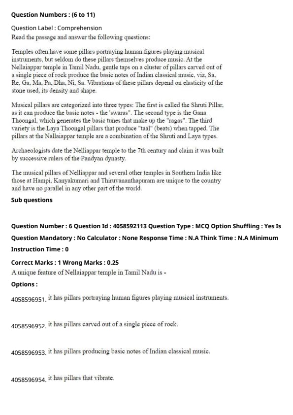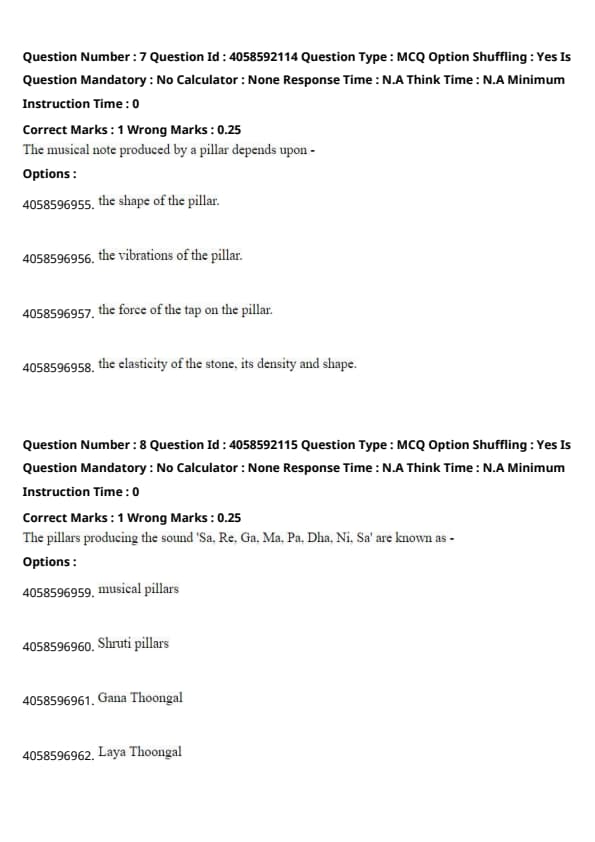 According to the passage, the sound produced by the pillars at the Nellaiappar temple depends on the elasticity of the stone, its density, and its shape, which influence the vibrations and the resulting musical notes. Quick Tip: In the study of acoustics, the material composition and structural characteristics significantly affect the sound quality and resonance of musical instruments.