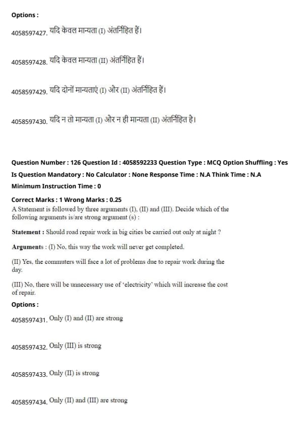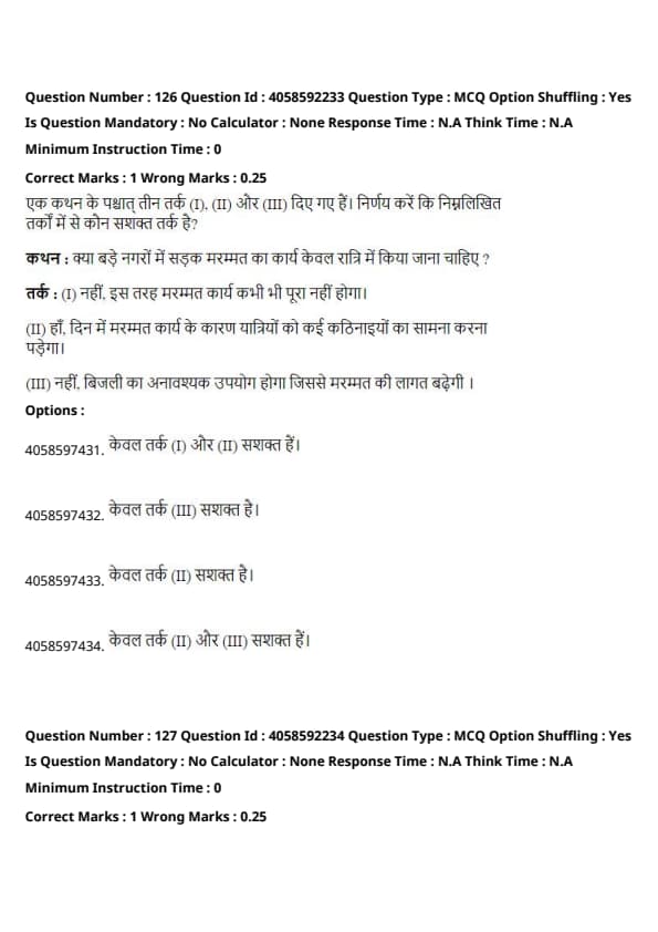 Argument (III) talks about the cost of electricity, but this does not provide a strong reason for carrying out repairs only at night. Quick Tip: When evaluating arguments, focus on the logic that directly supports or counters the statement.