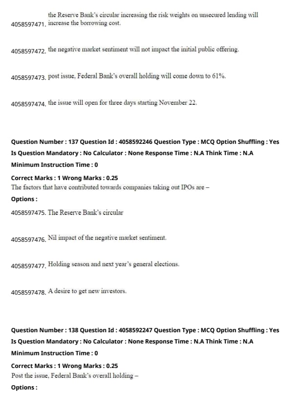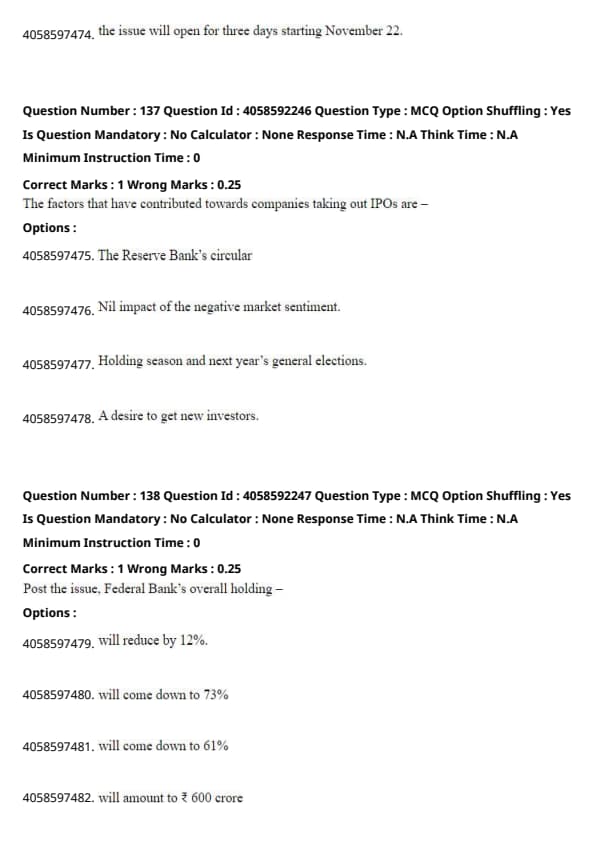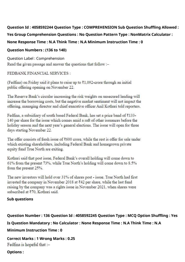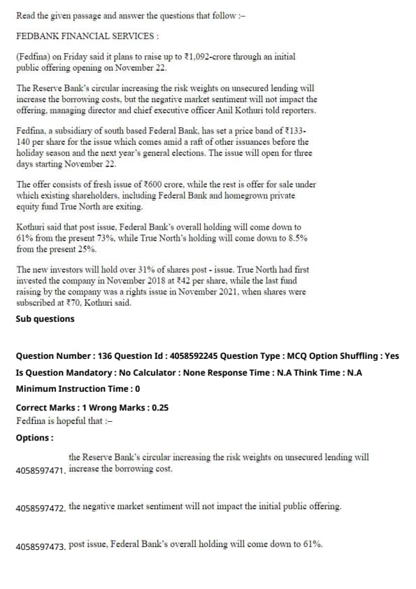 The passage specifies that Federal Bank's holding decreases post-issue. Although the calculated reduction is about 16.44%, if rounding or estimation was involved in forming the options, Option 1 ("Will reduce by 12%") might represent a simplified or approximate consideration of this decrease. Quick Tip: When questions ask about specific numerical changes, refer to the passage's figures or statements about changes in percentage or amounts.