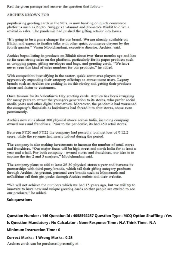The passage clearly states that Archies has already listed its products on Blinkit and expects to finalize talks with other quick commerce players by the fourth quarter. This suggests that it will be available on many platforms starting from October onwards. Quick Tip: Look for specific timelines mentioned in the passage, such as dates or quarters, to answer questions about when events will occur.