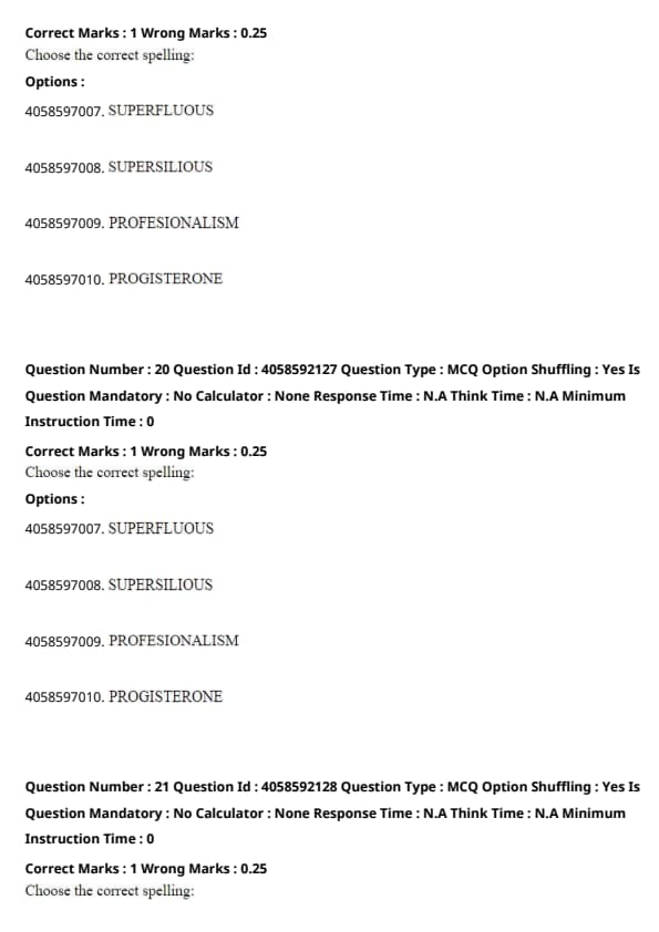 - "PROGISTERONE" is incorrect; the correct term is "progesterone". Quick Tip: For tricky words like "superfluous", "professionalism", and "progesterone", double-check the spelling using a dictionary to avoid common errors.