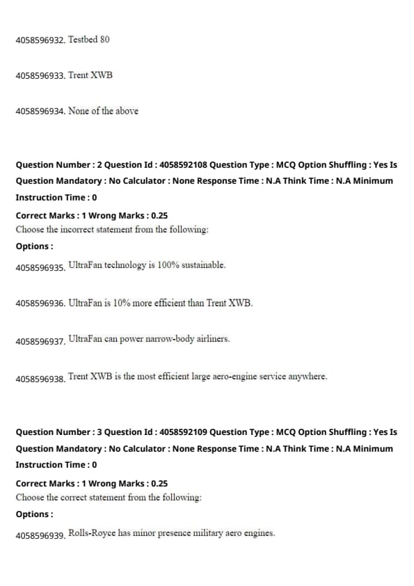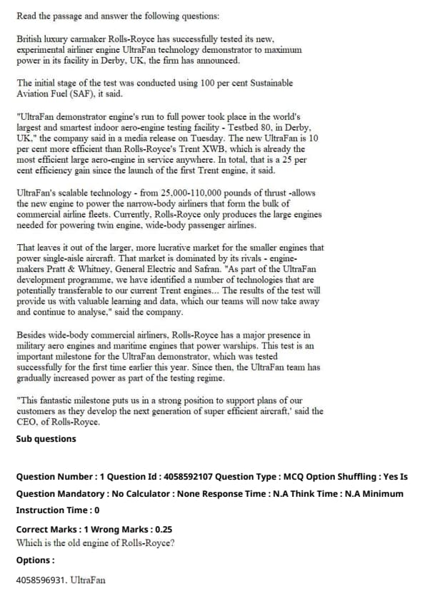 The incorrect statement is that UltraFan technology is 100% sustainable. The passage indicates that the initial stage of the test was conducted using 100% Sustainable Aviation Fuel (SAF), but this does not imply that the technology itself is 100% sustainable. Quick Tip: Always differentiate between fuel sustainability and technology sustainability when analyzing aerospace innovations to avoid misconceptions.