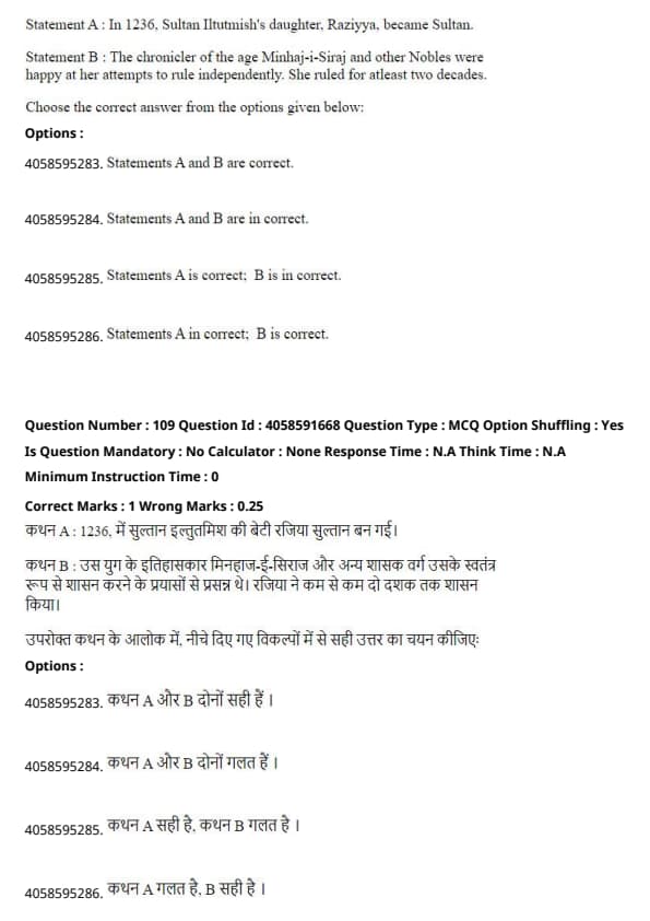 - Statement A is correct. Sultan Iltutmish’s daughter, Raziyya, became Sultan of Delhi in 1236. - Statement B is incorrect. While Raziyya attempted to rule independently, she was not supported by all nobles and chroniclers like Minhaj-i-Siraj. She faced resistance during her reign and was eventually deposed. Thus, Statement A is correct, and Statement B is incorrect. Quick Tip: When discussing historical figures, verify the support they received from contemporaries, especially in monarchical contexts.