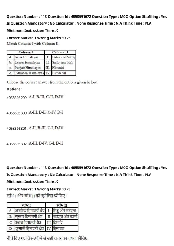 The correct matching of the columns is as follows: A. Inner Himalayas corresponds to III. Himadri. B. \text{Lesser Himalayas corresponds to IV. Himachal. C. Punjab Himalayas corresponds to I. Indus and Satluj. D. \text{Kumaon Himalayas corresponds to II. Satluj and Kali. Thus, the correct answer is (4) A-III, B-IV, C-I, D-II. Quick Tip: When matching regions to their geographical characteristics, be familiar with the distinct features of each Himalayan region.