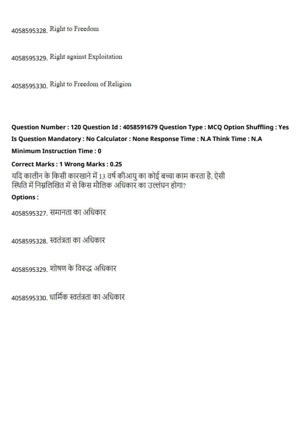 The Right against Exploitation, which is enshrined in Article 23 of the Indian Constitution, prohibits child labor and human trafficking. If a 13-year-old child is working in a factory, it violates this fundamental right. Quick Tip: The Right against Exploitation ensures that no one is forced to work under exploitative conditions, particularly minors.
