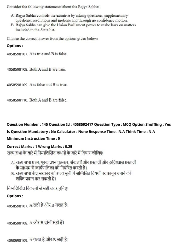 - Statement A is false because the Rajya Sabha does not have the power to pass a No Confidence Motion against the government. This power is exclusive to the Lok Sabha. However, it can control the executive by raising questions, discussions, and motions.