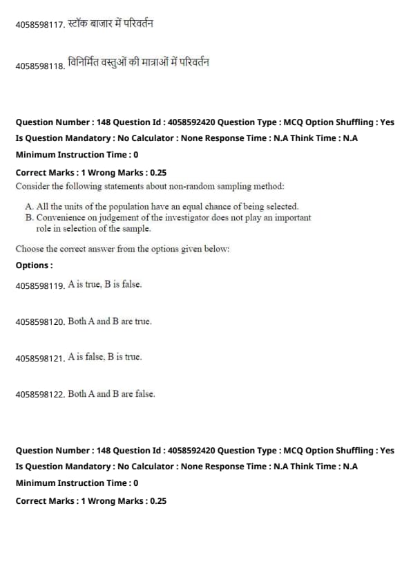- Non-random sampling (also known as non-probability sampling) is a method where not all units in the population have an equal chance of being selected. Instead, selection is based on convenience, judgment, or other non-random criteria. This makes Statement A false.