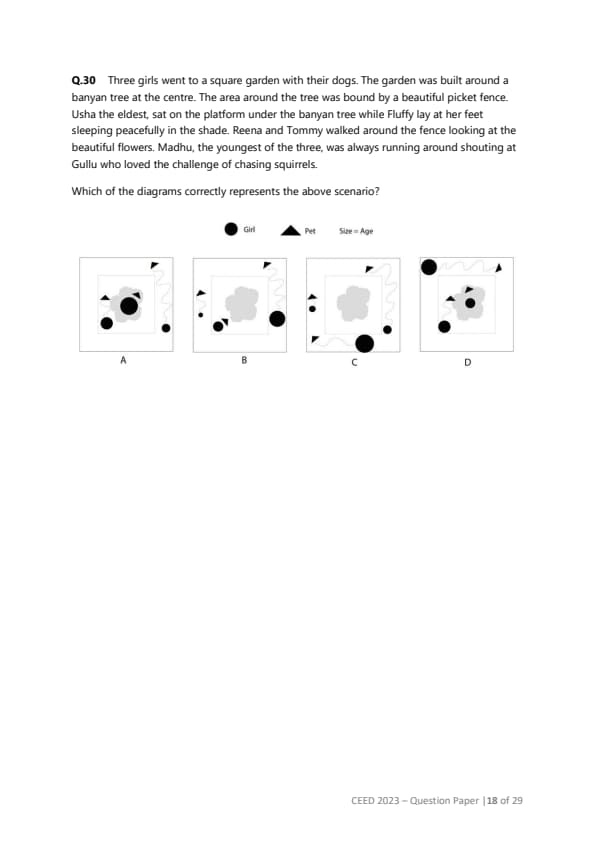 Three girls went to a square garden with their dogs. The garden was built around a banyan tree at the centre. The area around the tree was bound by a beautiful picket fence. Usha, the eldest, sat on the platform under the banyan tree while Fluffy lay at her feet sleeping peacefully in the shade. Reena and Tommy walked around the fence looking at the beautiful flowers. Madhu, the youngest of the three, was always running around shouting at Gullu who loved the challenge of chasing squirrels. Which of the diagrams correctly represents the above scenario?