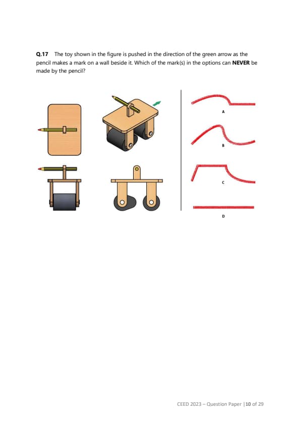 The toy shown in the figure is pushed in the direction of the green arrow as the pencil makes a mark on a wall beside it. Which of the mark(s) in the options can NEVER be made by the pencil?