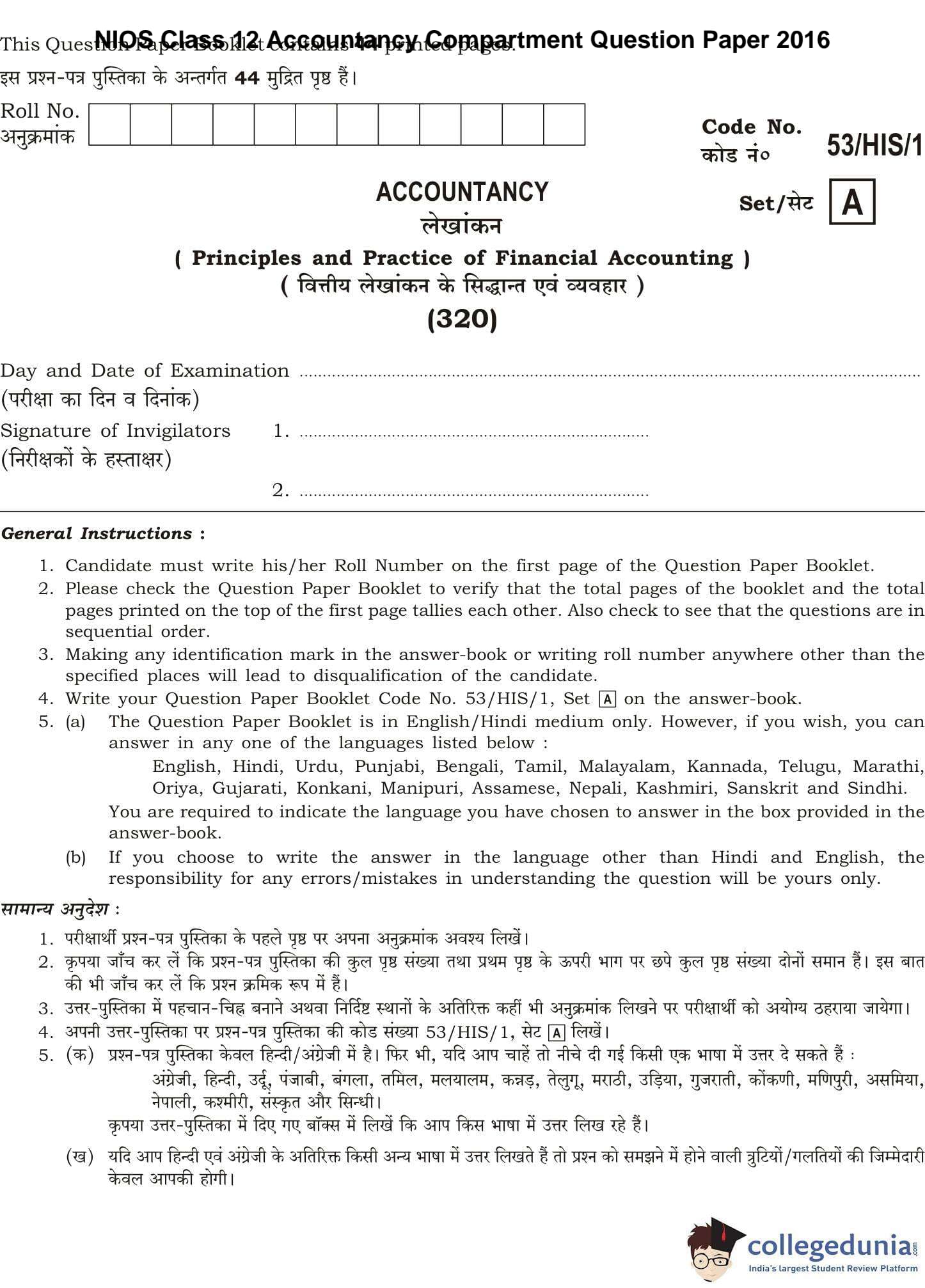 NIOS Class 12 Accountancy Compartment Question Paper 2016 with Answer Key pdf is available for download here. The exam was conducted by National Institute of Open Schooling on October 25, 2016 in the Afternoon Session 3 PM to 6 PM. The question paper comprised a total of 27 questions divided among 2 sections.