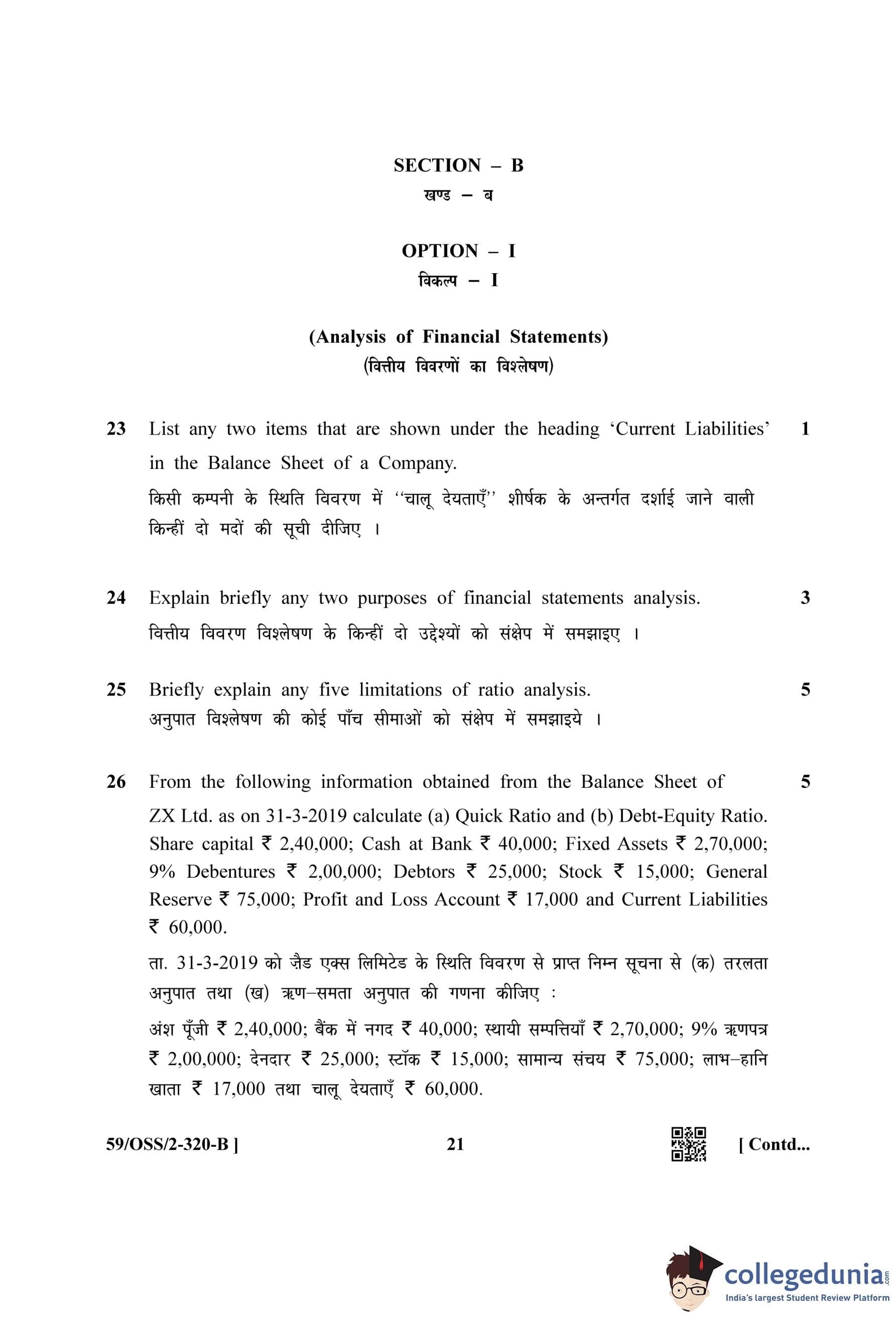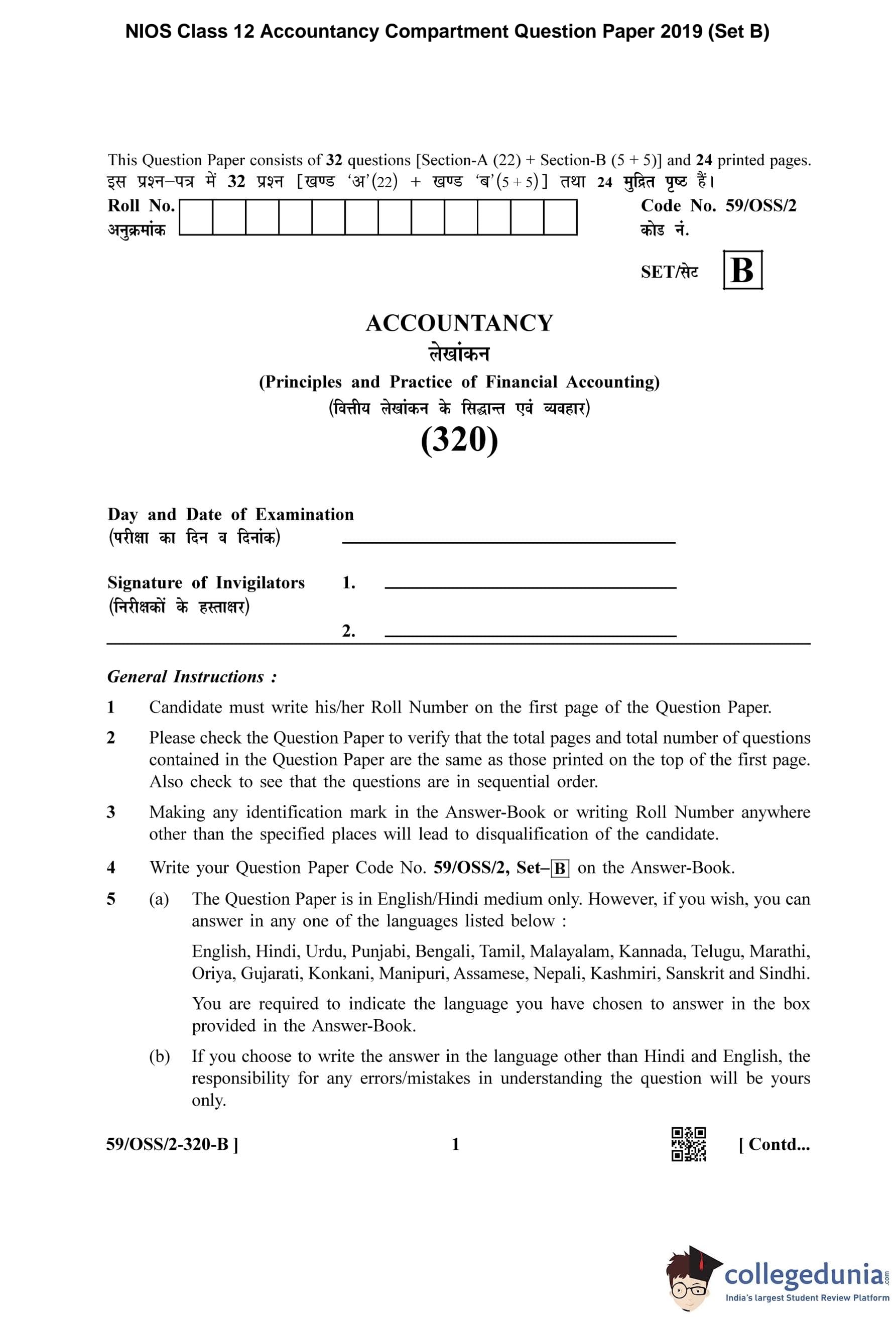 NIOS Class 12 Accountancy Compartment Question Paper 2019 with Answer Key pdf (Set B) is available for download here. The exam was conducted by National Institute of Open Schooling on October 31, 2019 in the Afternoon Session 2:30 PM to 5:30 PM. The question paper comprised a total of 27 questions divided among 2 sections.
