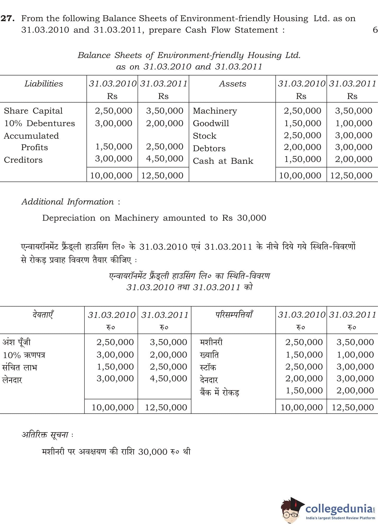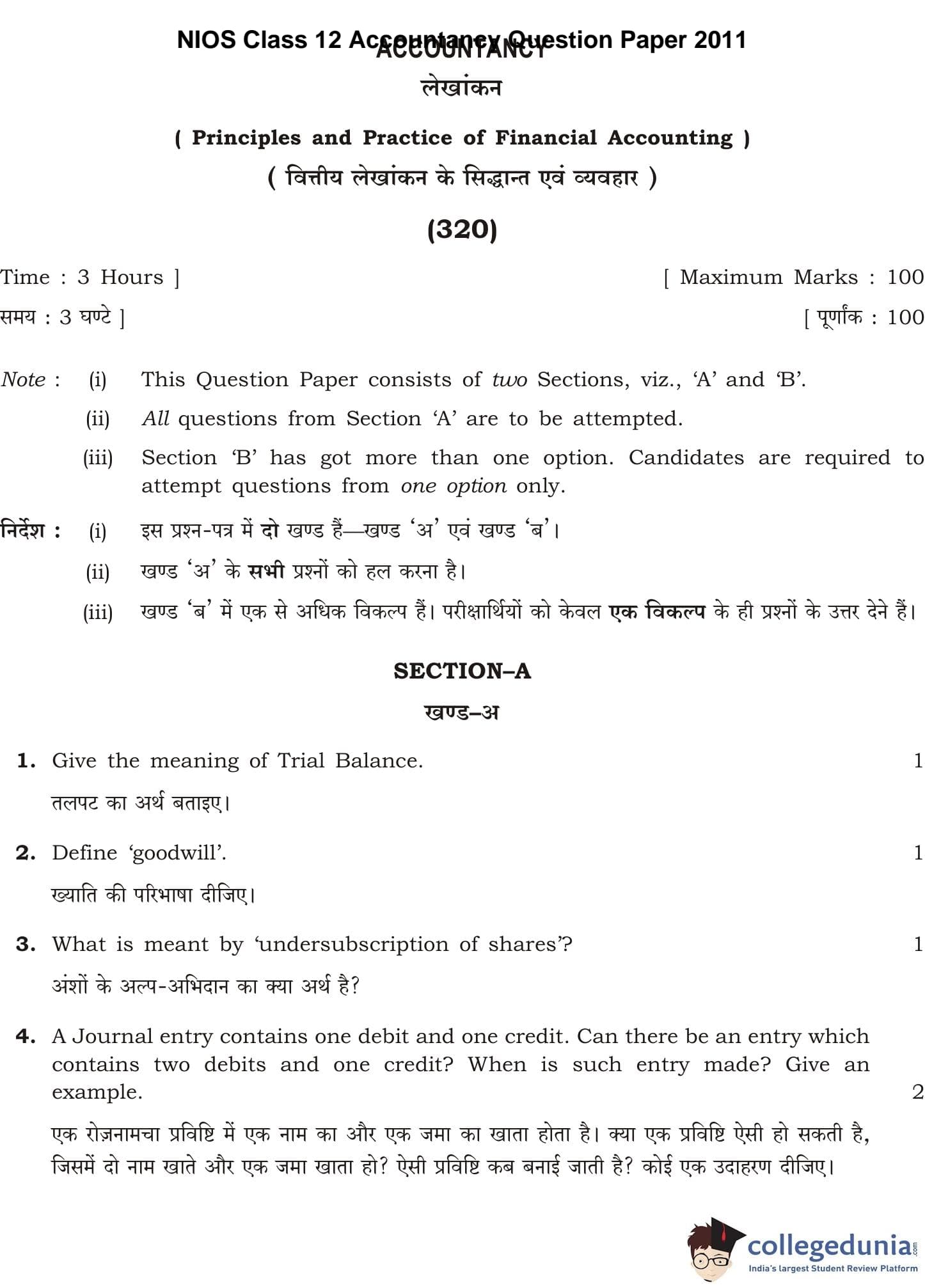 NIOS Class 12 Accountancy Question Paper 2011 with Answer Key pdf is available for download here. The exam was conducted by National Institute of Open Schooling. The question paper comprised a total of 27 questions divided among 2 sections.