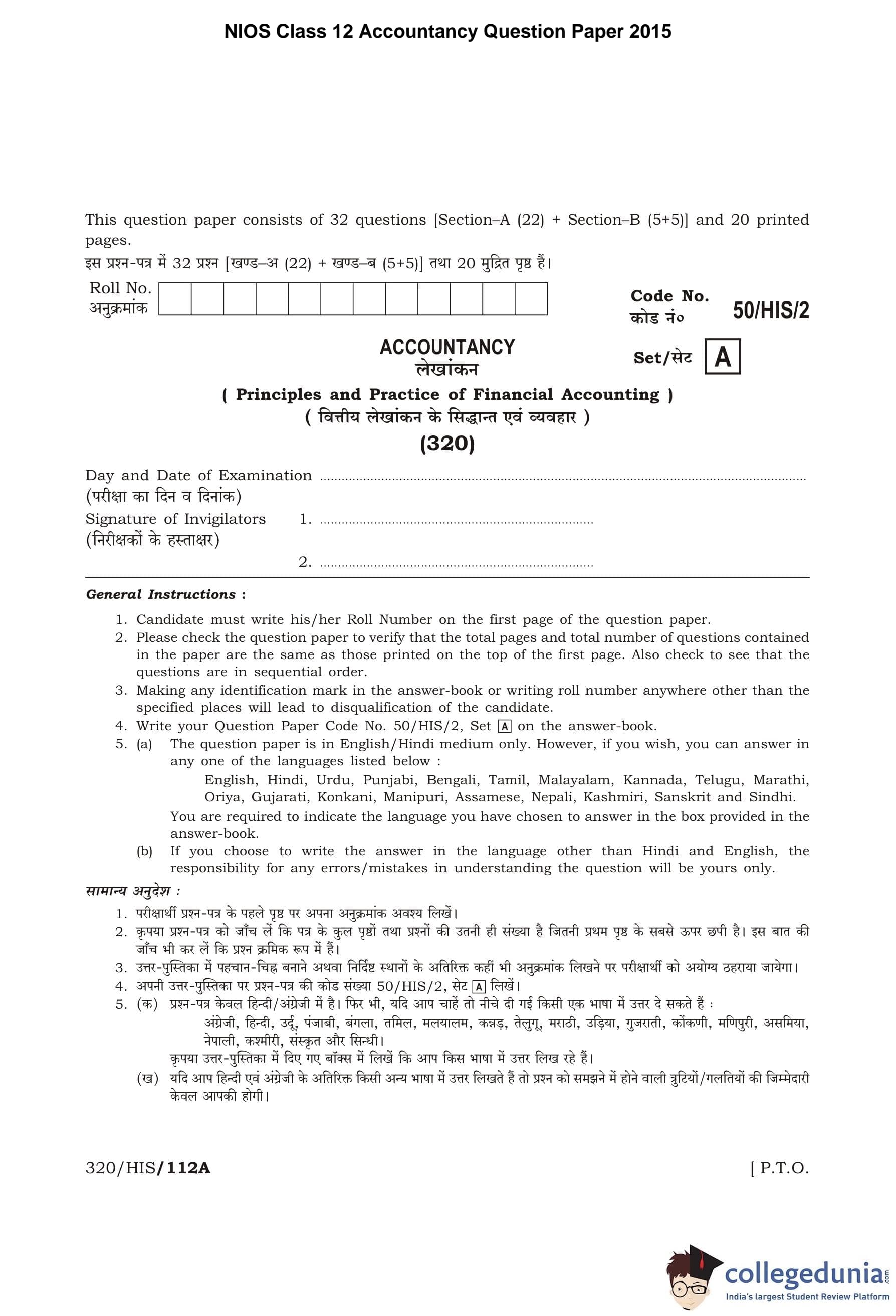 NIOS Class 12 Accountancy Question Paper 2015 with Answer Key pdf is available for download here. The exam was conducted by National Institute of Open Schooling on April 17, 2015 in the Afternoon Session 2:30 PM to 5:30 PM. The question paper comprised a total of 27 questions divided among 2 sections.