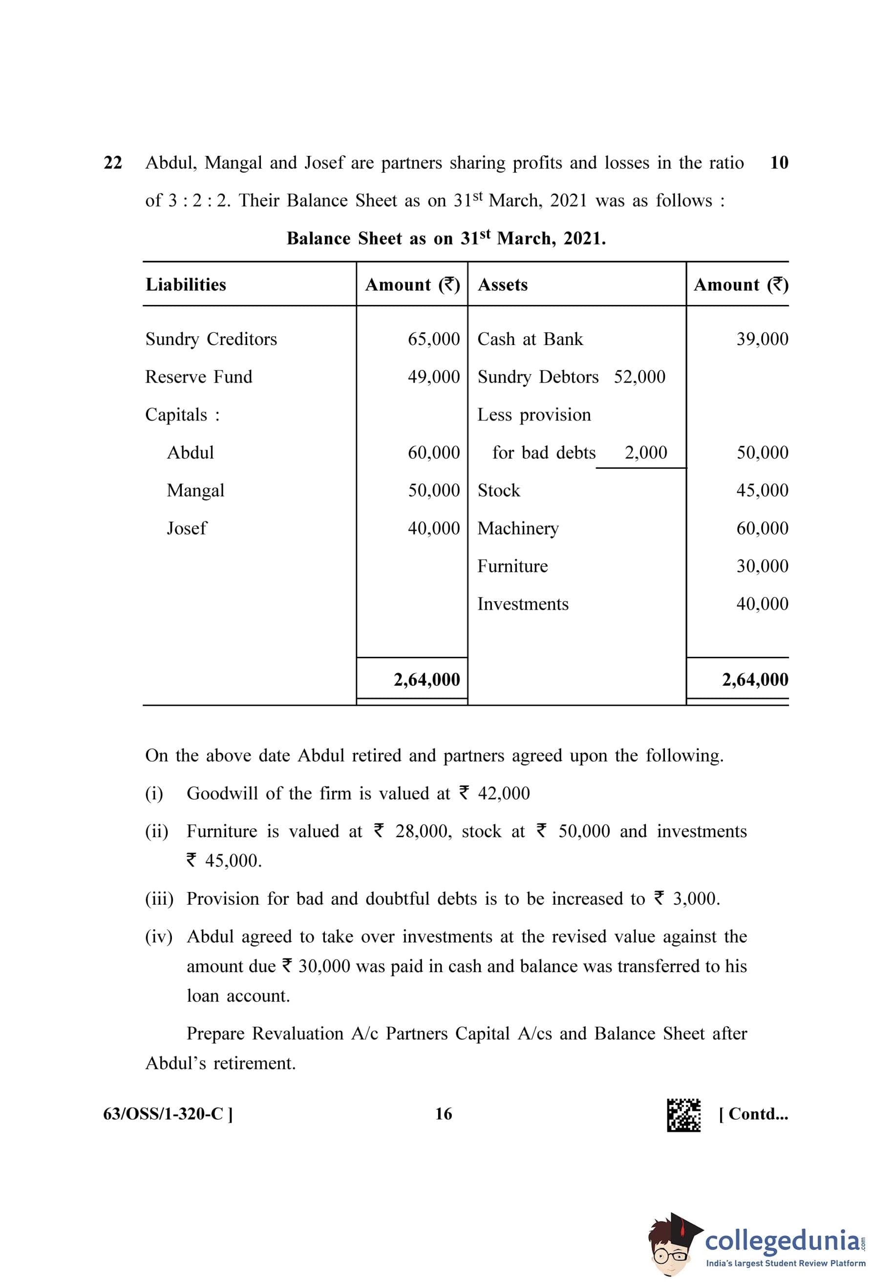 NIOS Class 12 Accountancy Question Paper 2022 with Answer Key pdf (Set C - OSS) is available for download here. The exam was conducted by National Institute of Open Schooling on April 28, 2022 in the Afternoon Session 2:30 PM to 5:30 PM. The question paper comprised a total of 27 questions divided among 2 sections.