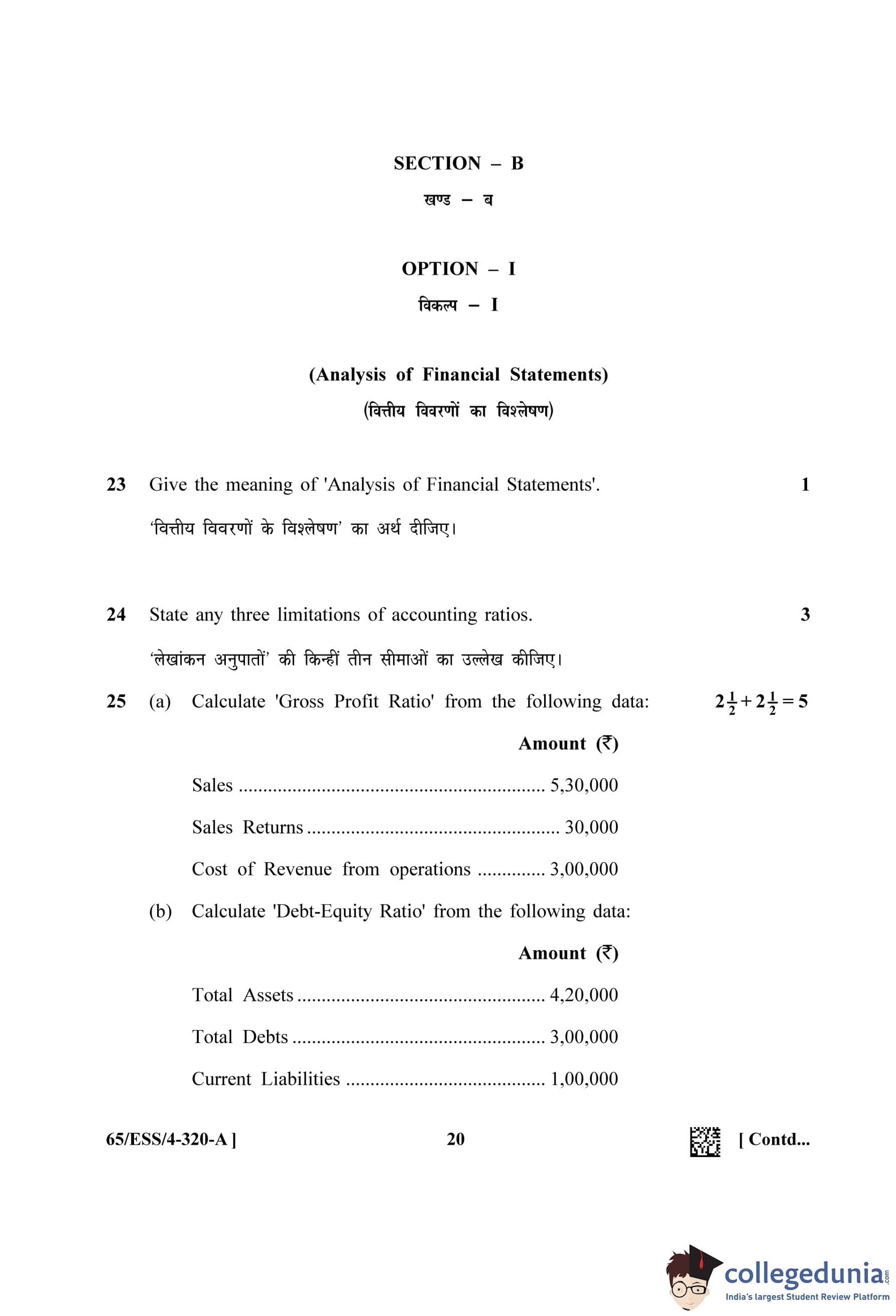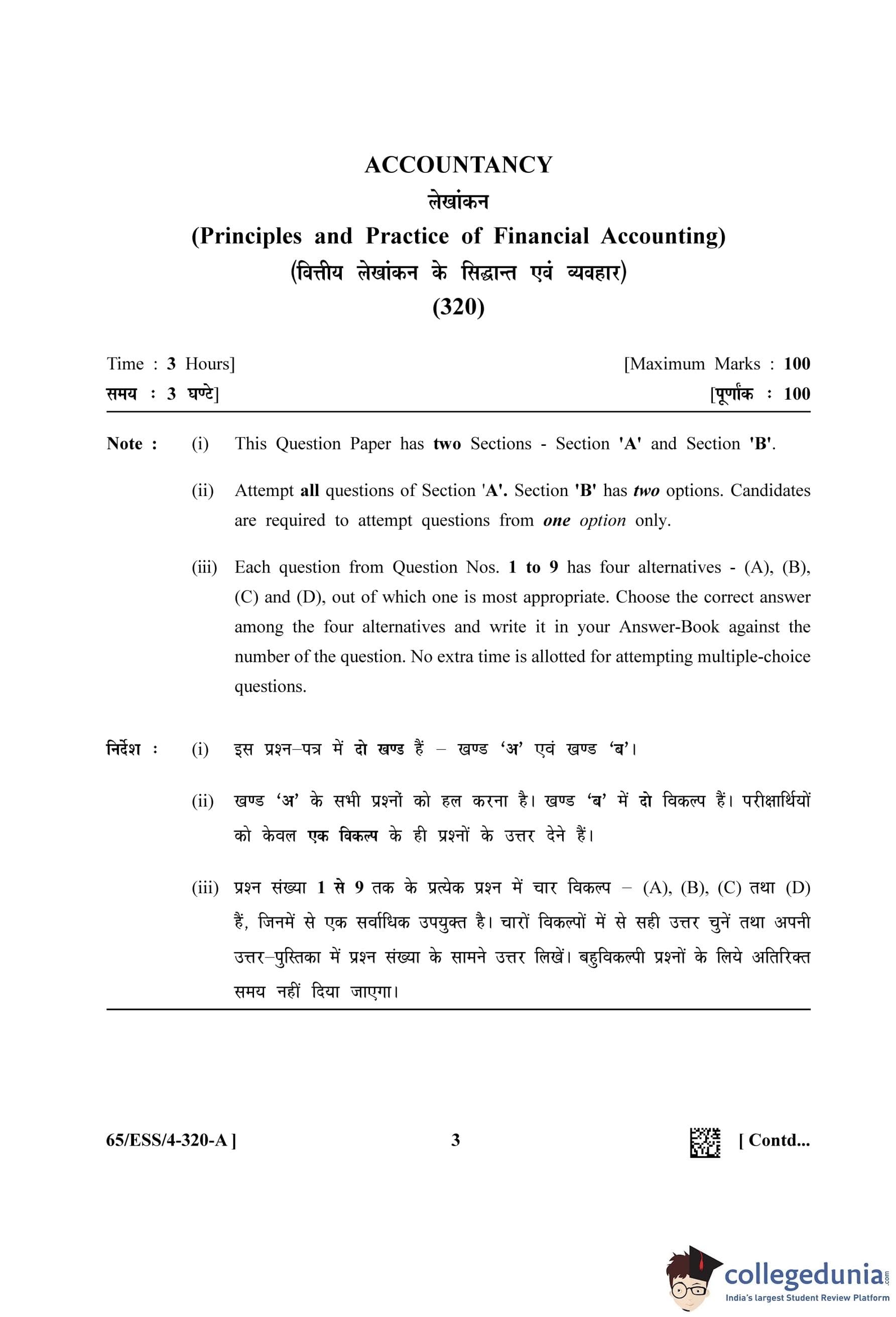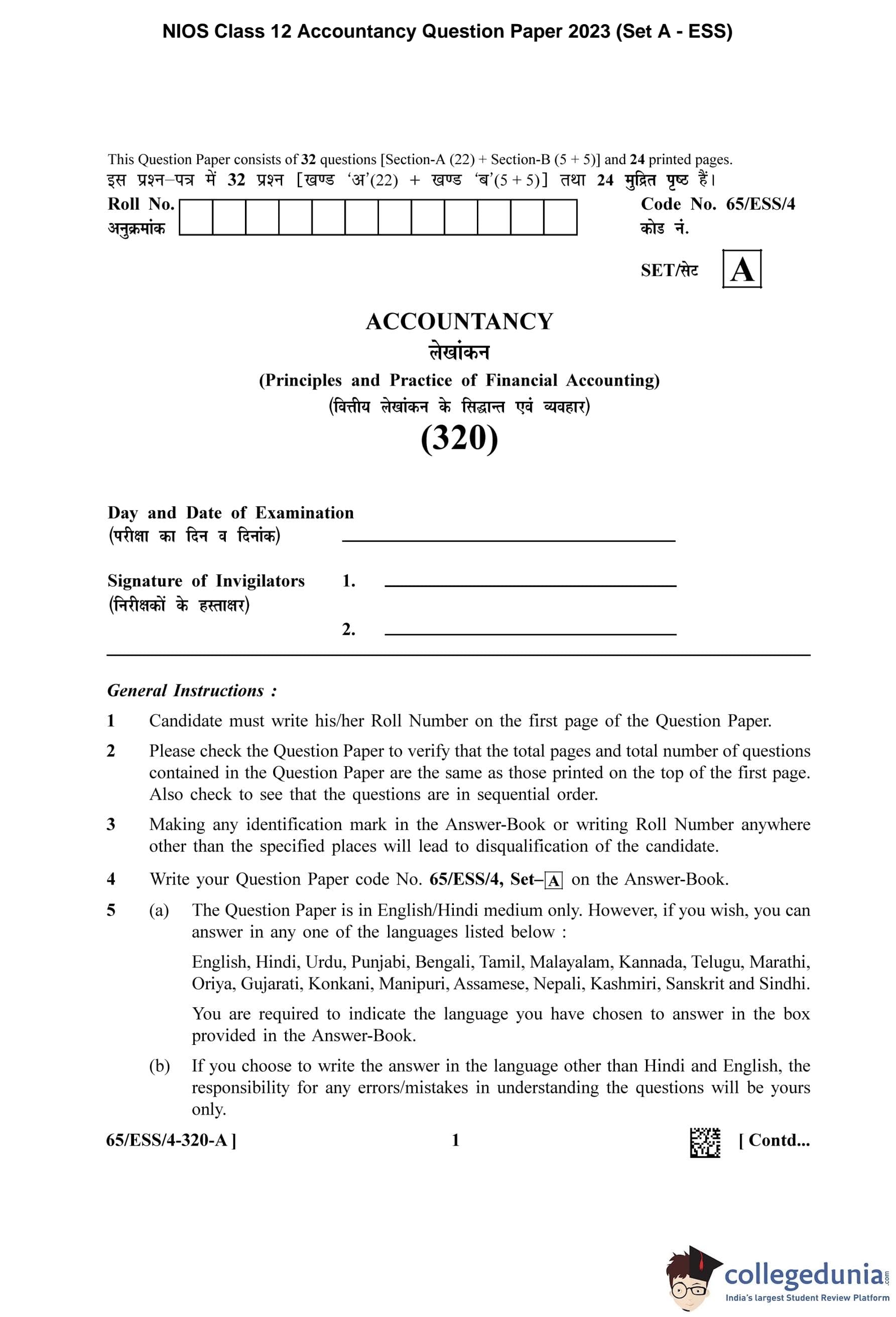 NIOS Class 12 Accountancy Question Paper 2023 with Answer Key pdf (Set A - ESS) is available for download here. The exam was conducted by National Institute of Open Schooling on April 26, 2023 in the Afternoon Session 2.30 PM to 5.30 PM. The question paper comprised a total of 32 questions divided among 2 sections.
