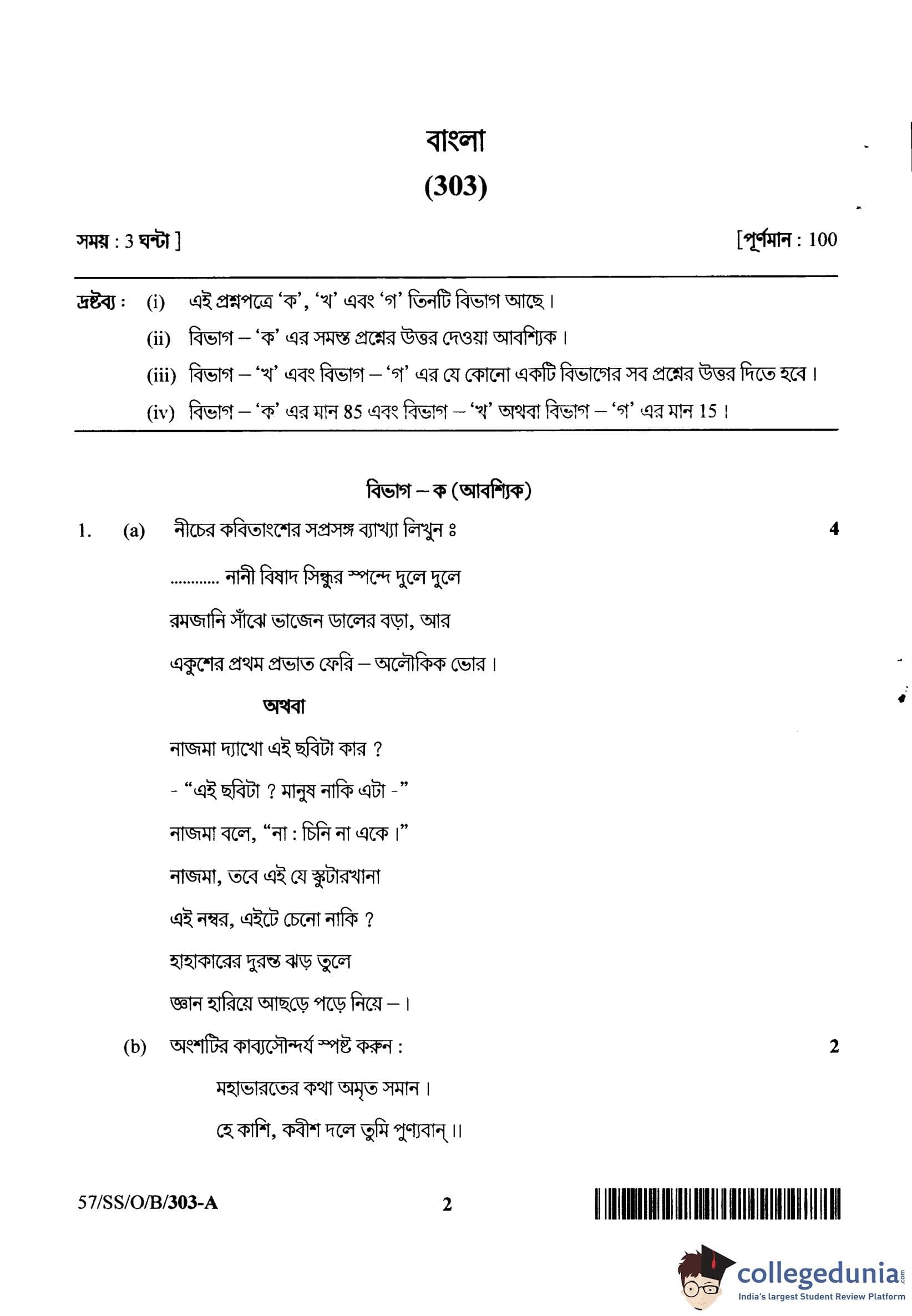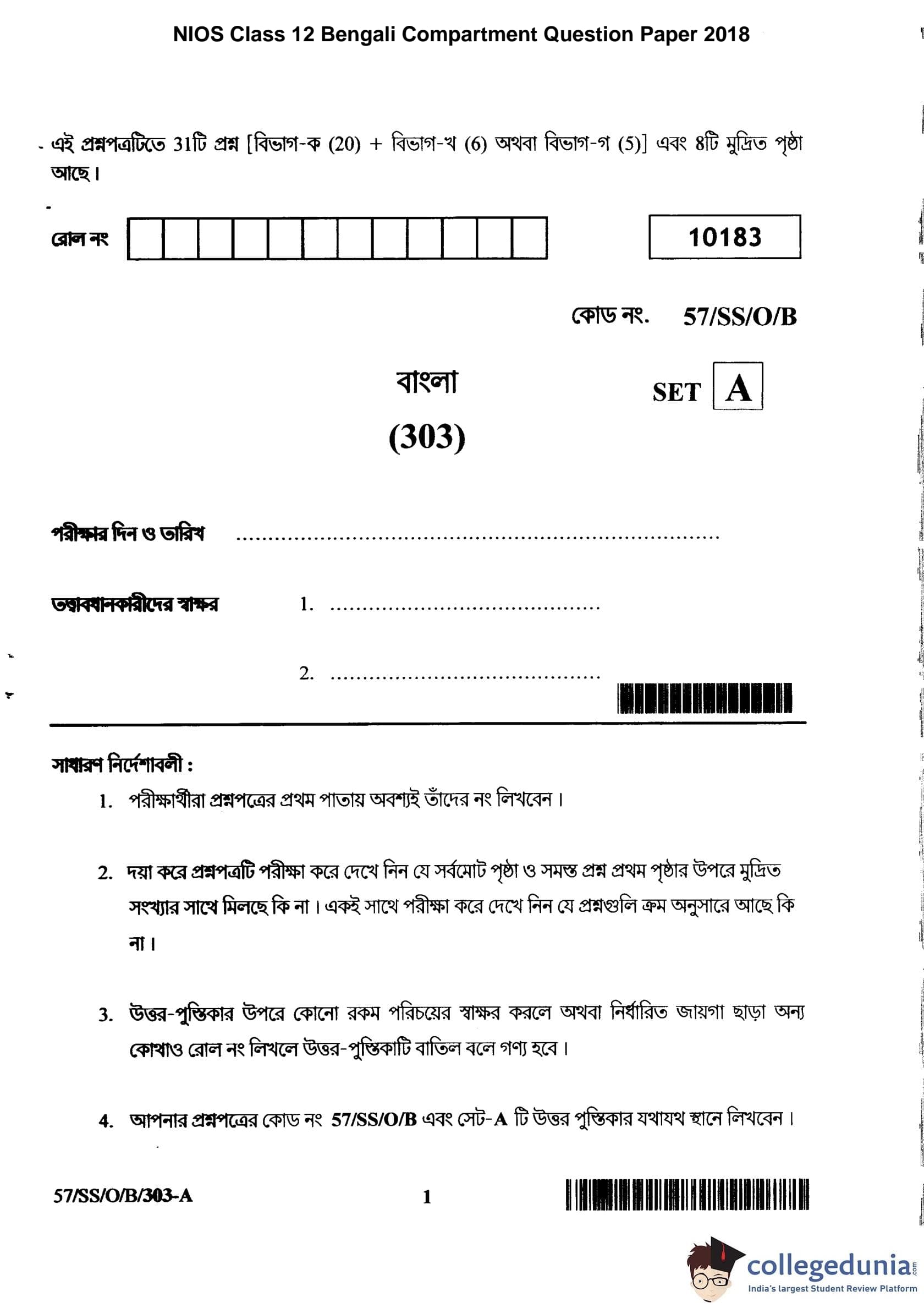 NIOS Class 12 Bengali Compartment Question Paper 2018 with Answer Key pdf is available for download here. The exam was conducted by National Institute of Open Schooling on November 5, 2018 in the Afternoon Session 2:30 PM to 5:30 PM. The question paper comprised a total of 25 questions divided among 3 sections.