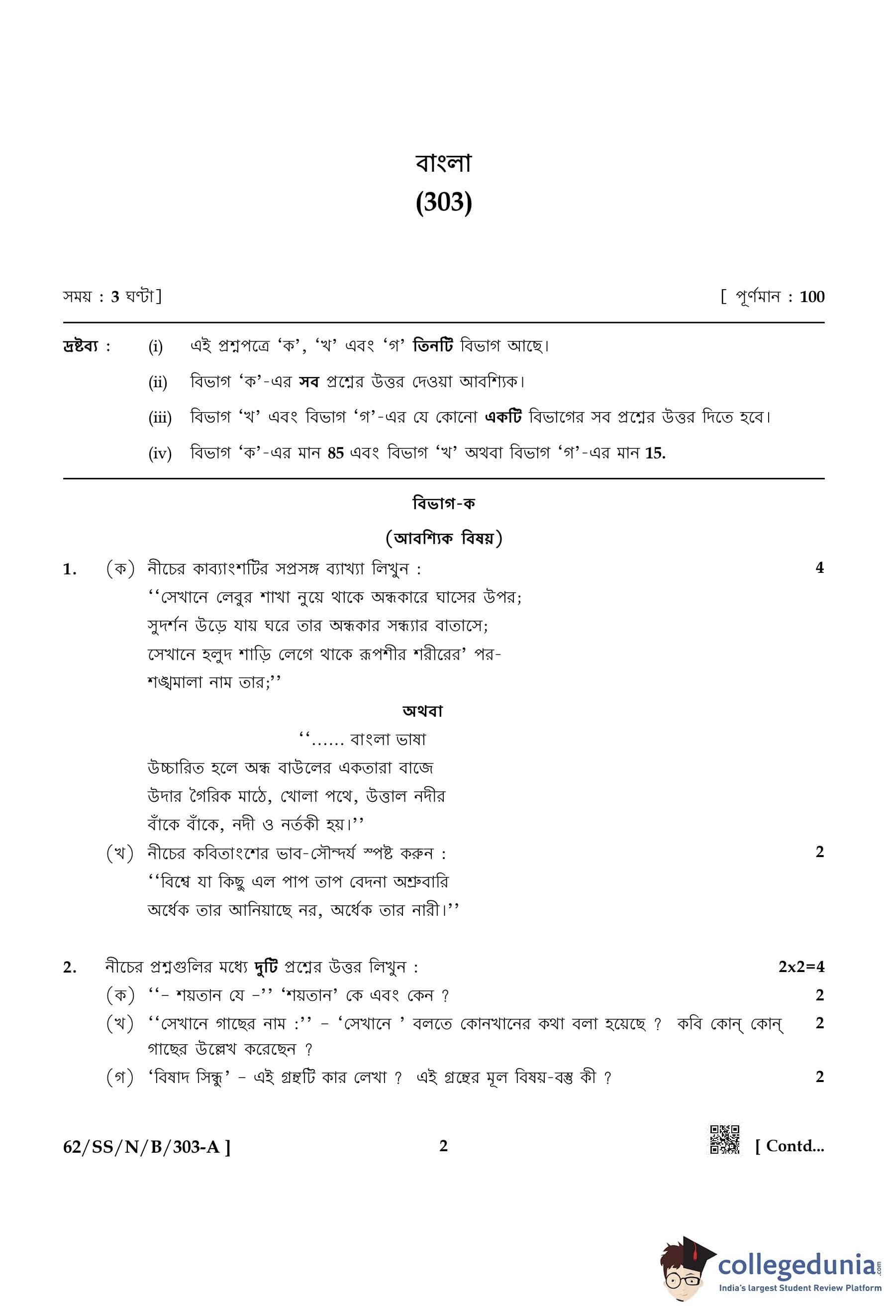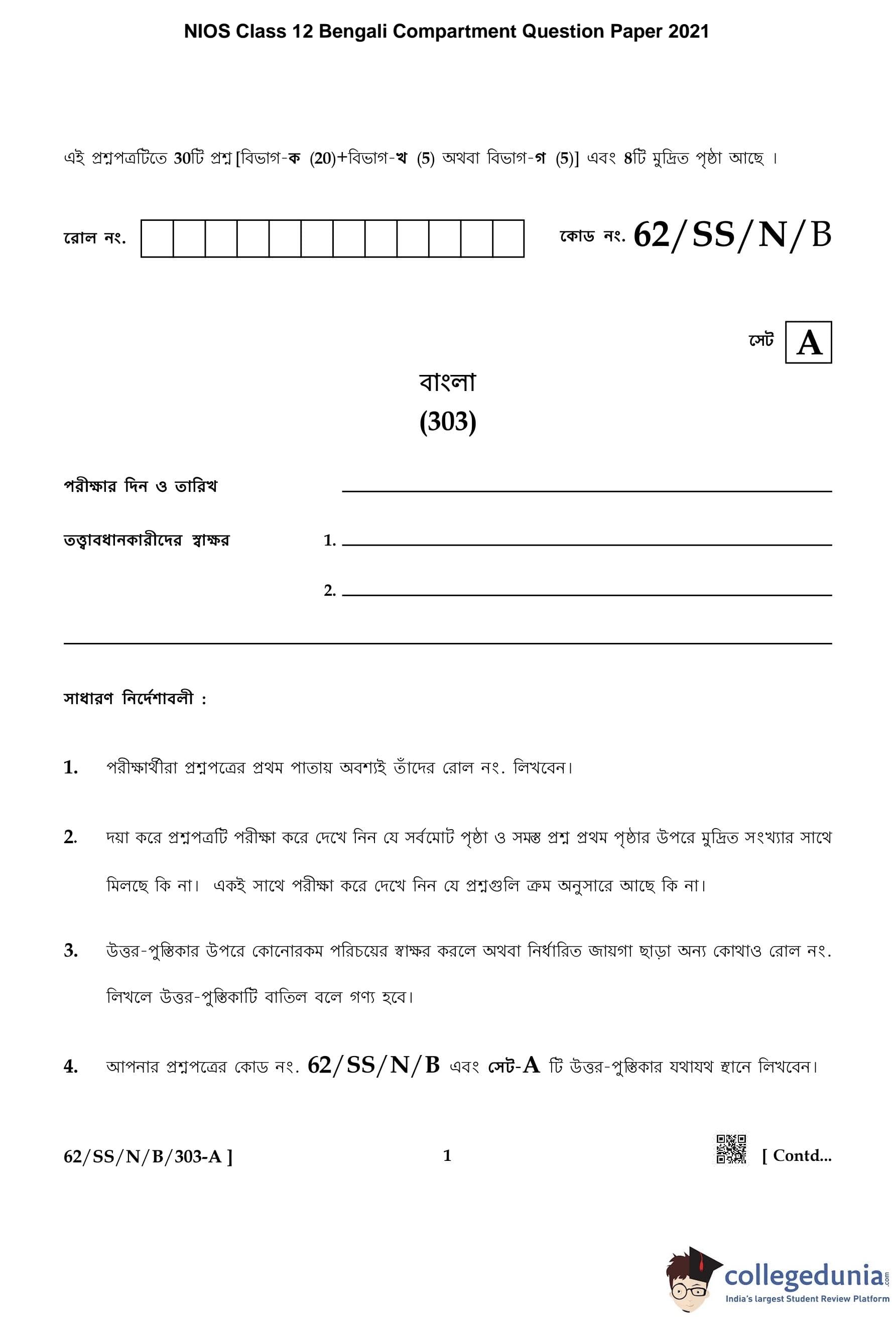 NIOS Class 12 Bengali Compartment Question Paper 2021 with Answer Key pdf is available for download here. The exam was conducted by National Institute of Open Schooling on November 26, 2021 in the Afternoon Session 2:30 PM to 5:30 PM. The question paper comprised a total of 25 questions divided among 3 sections.