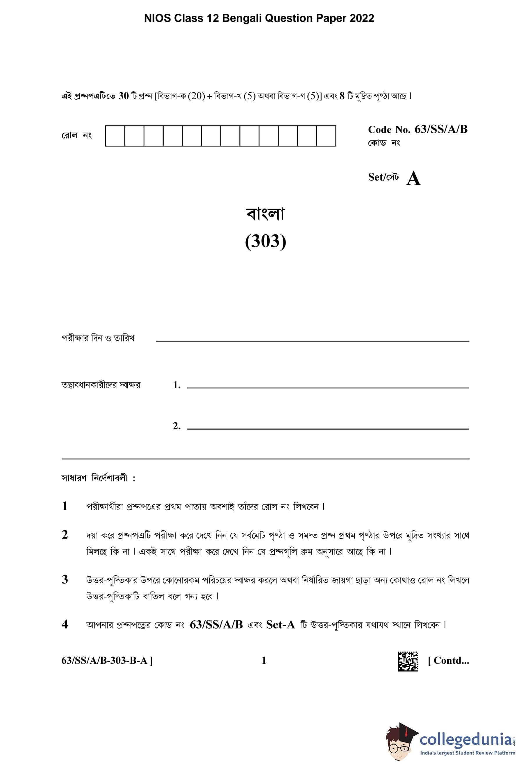 NIOS Class 12 Bengali Question Paper 2022 with Answer Key