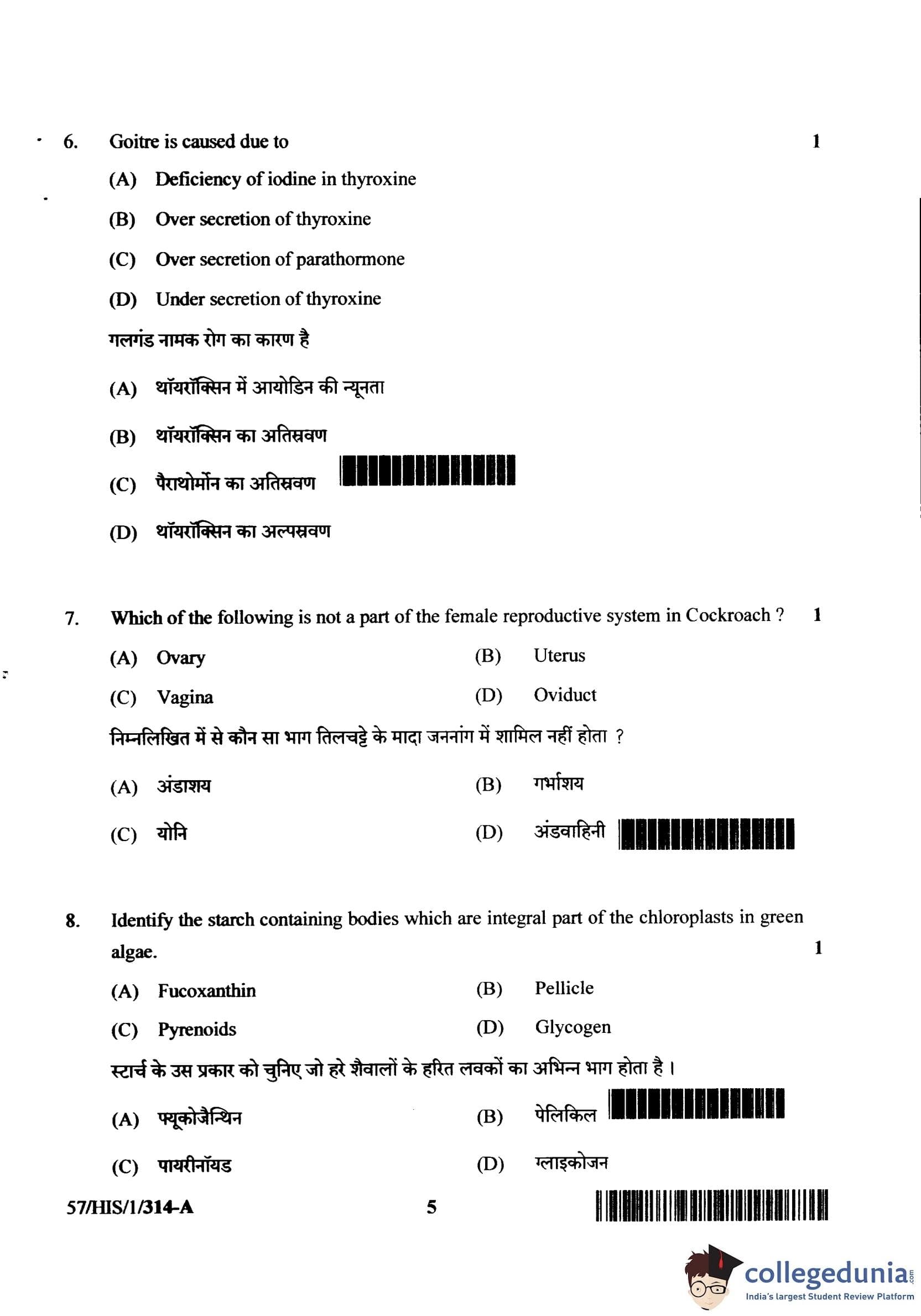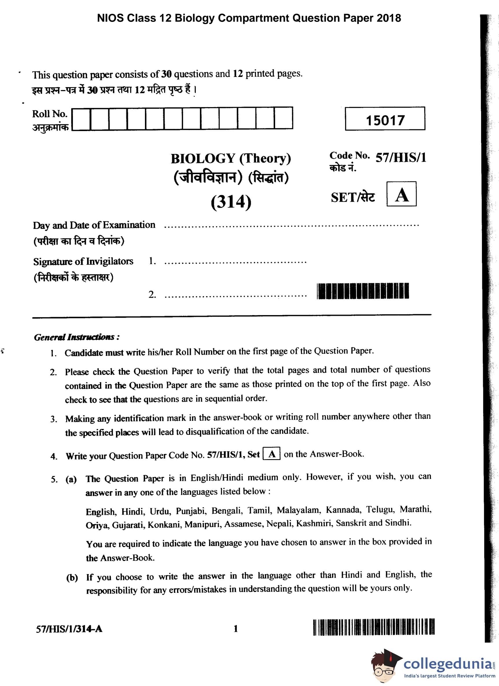 NIOS Class 12 Biology Compartment Question Paper 2018 with Answer Key