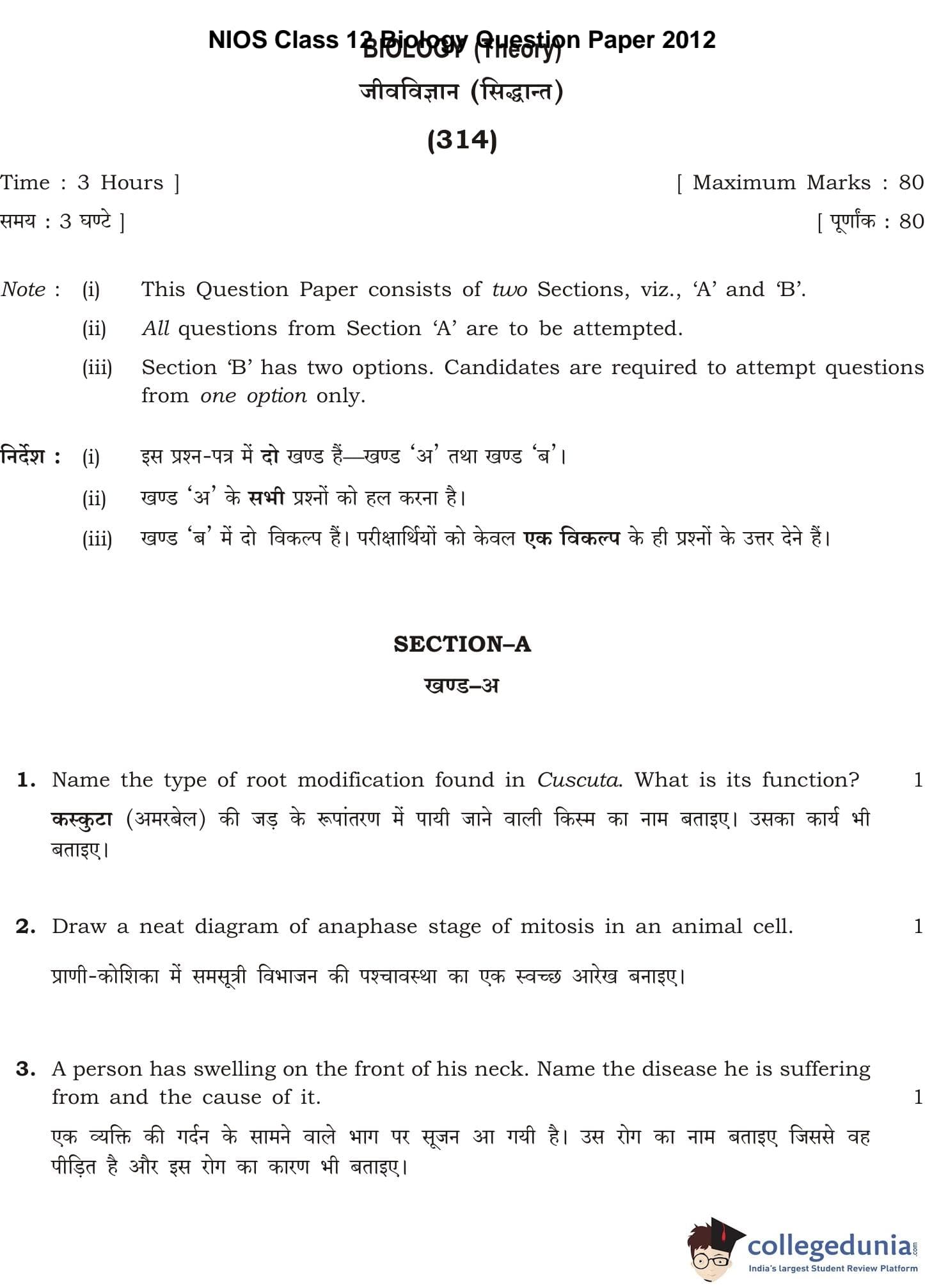 NIOS Class 12 Biology Question Paper 2012 with Answer Key pdf is available for download here. The exam was conducted by National Institute of Open Schooling. The question paper comprised a total of 26 questions divided among 2 sections.