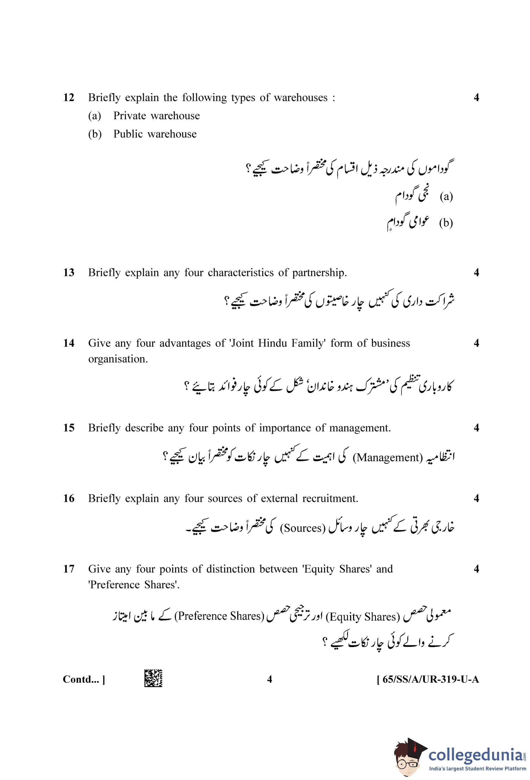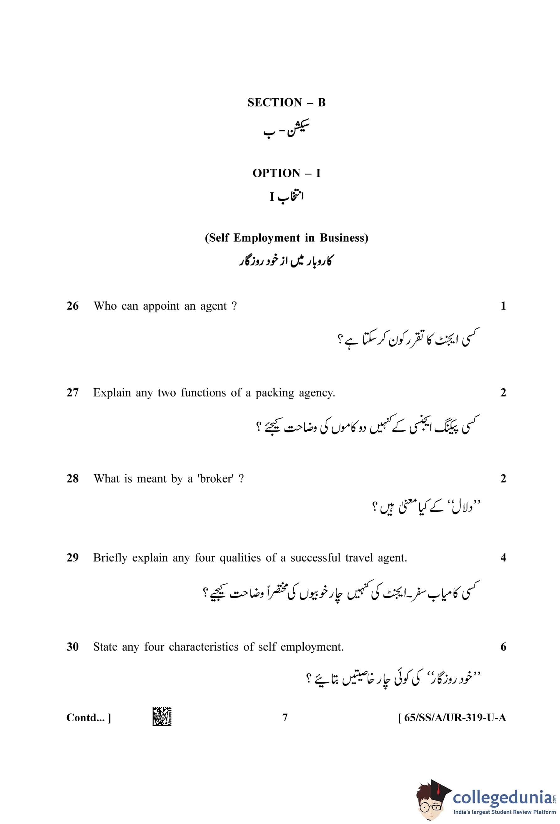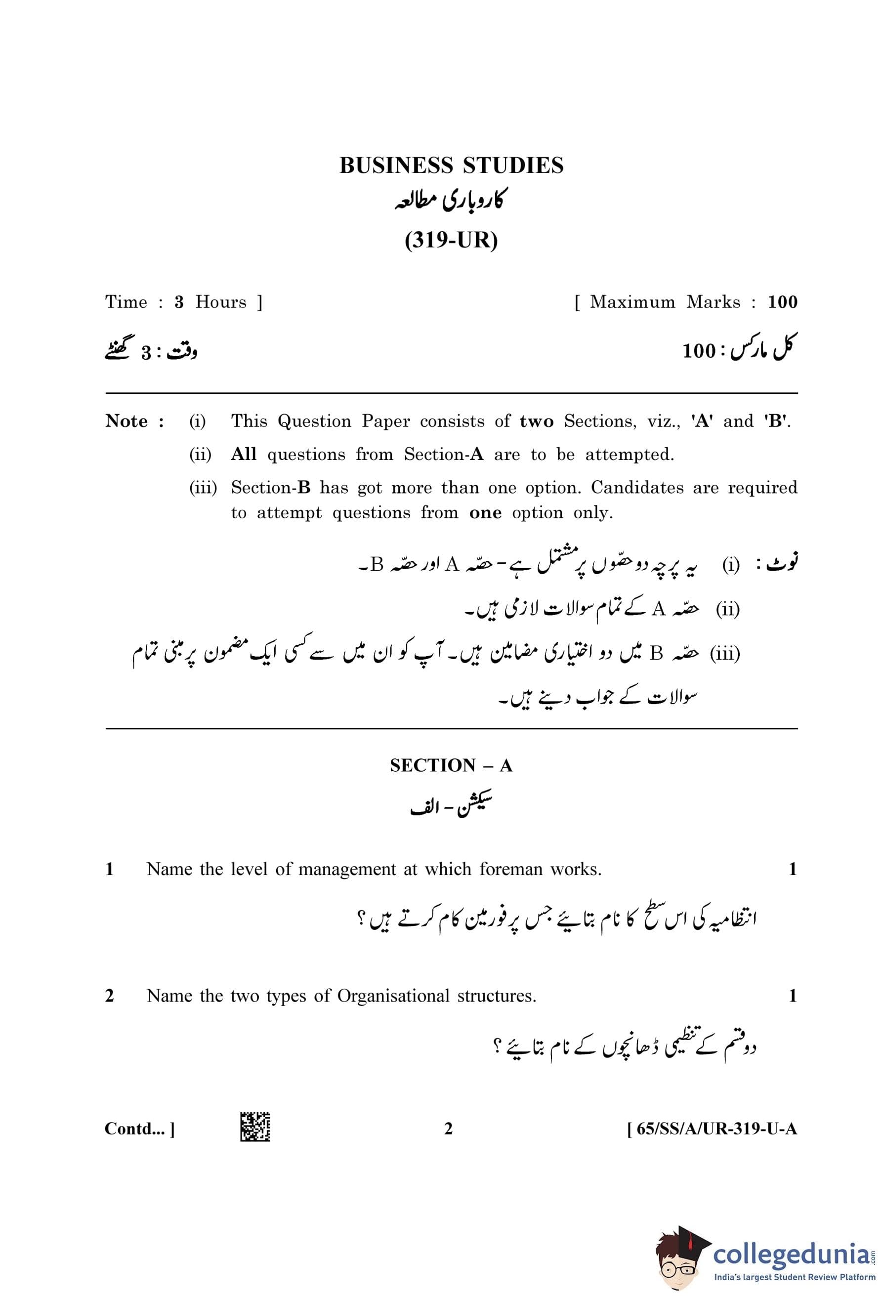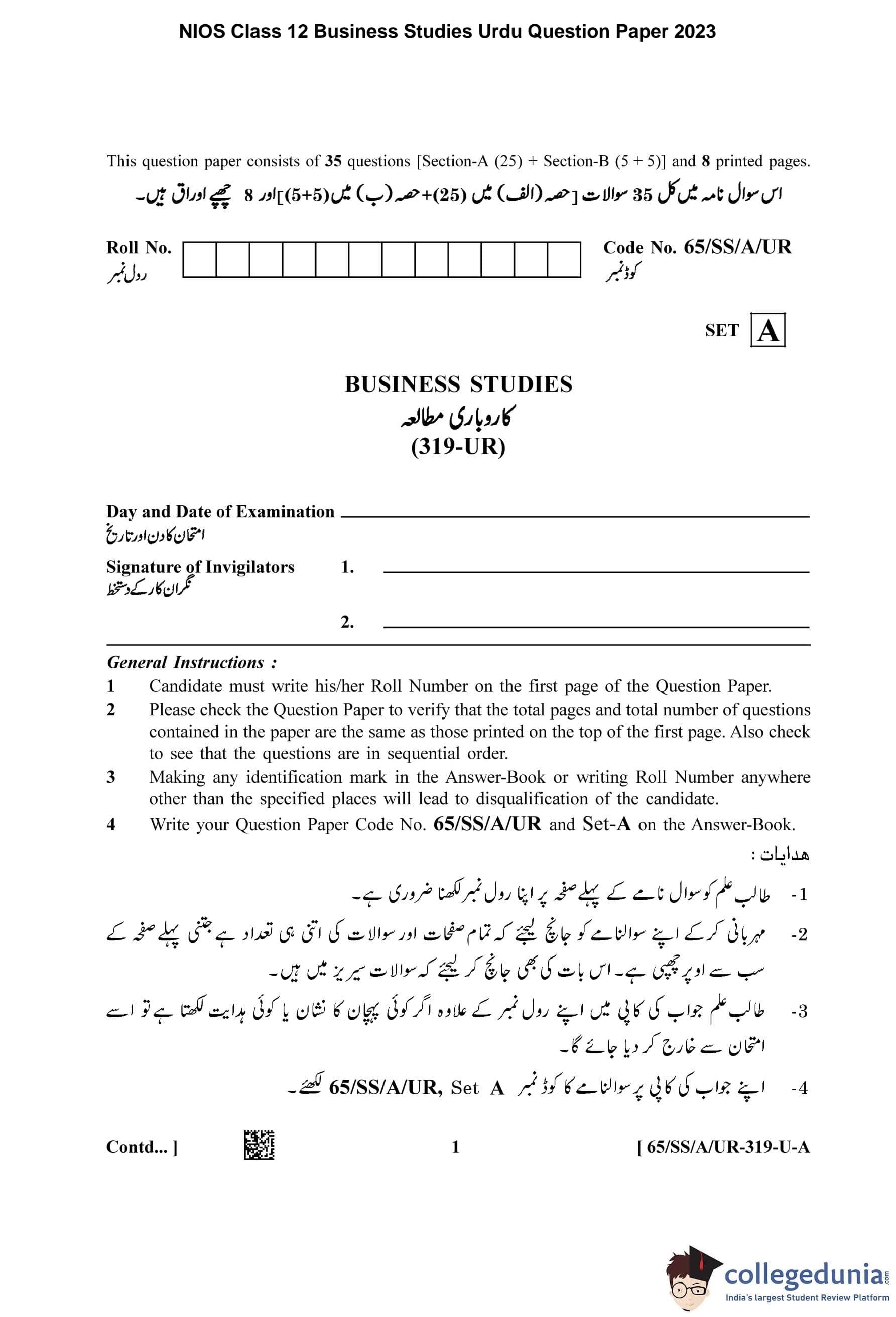 NIOS Class 12 Business Studies Urdu (Set A) Question Paper 2023 with Answer Key