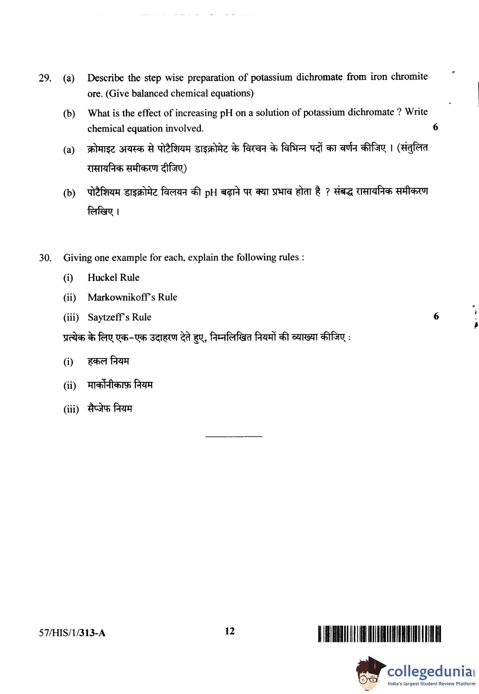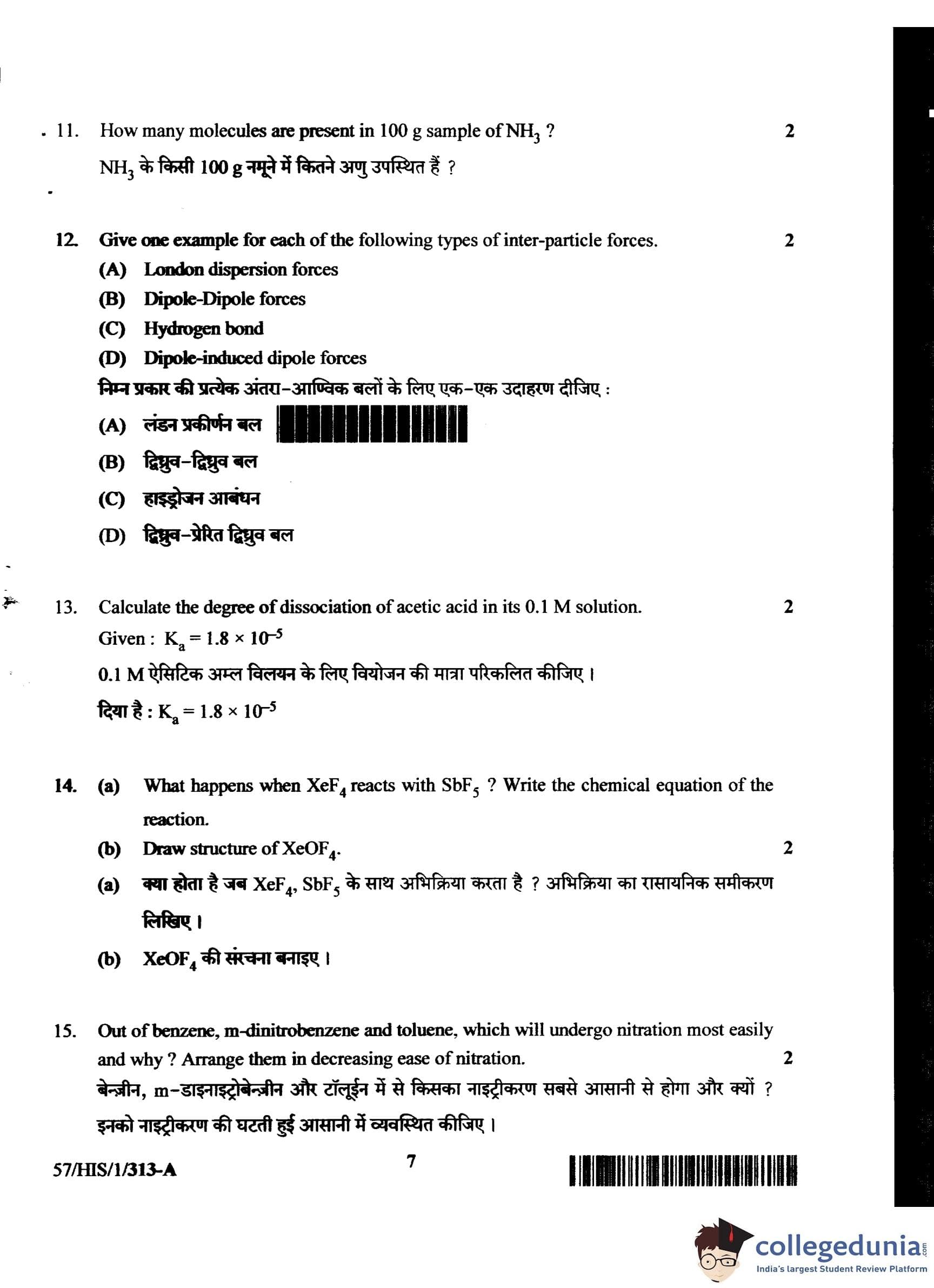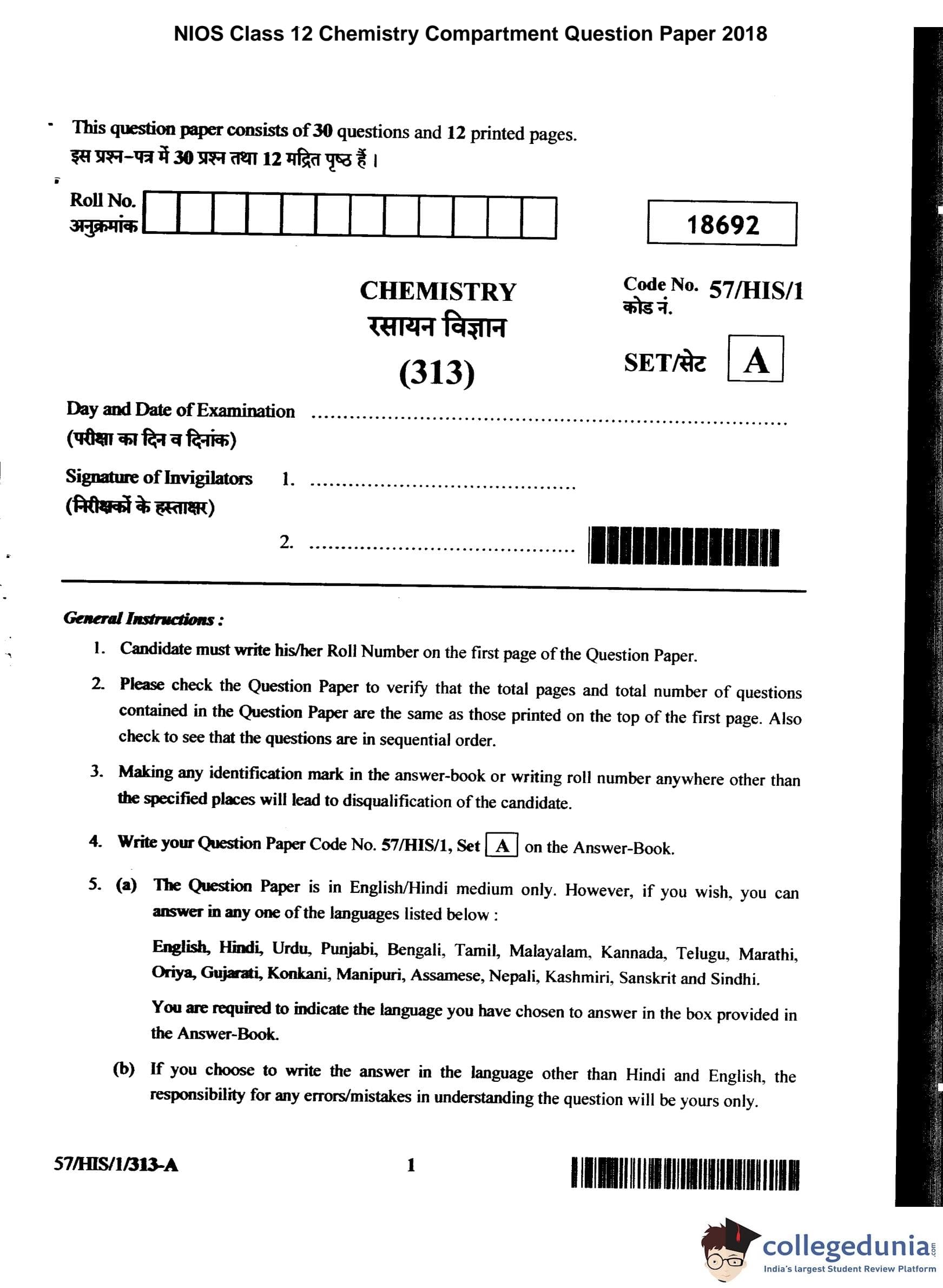NIOS Class 12 Chemistry Compartment Question Paper 2018 with Answer Key
