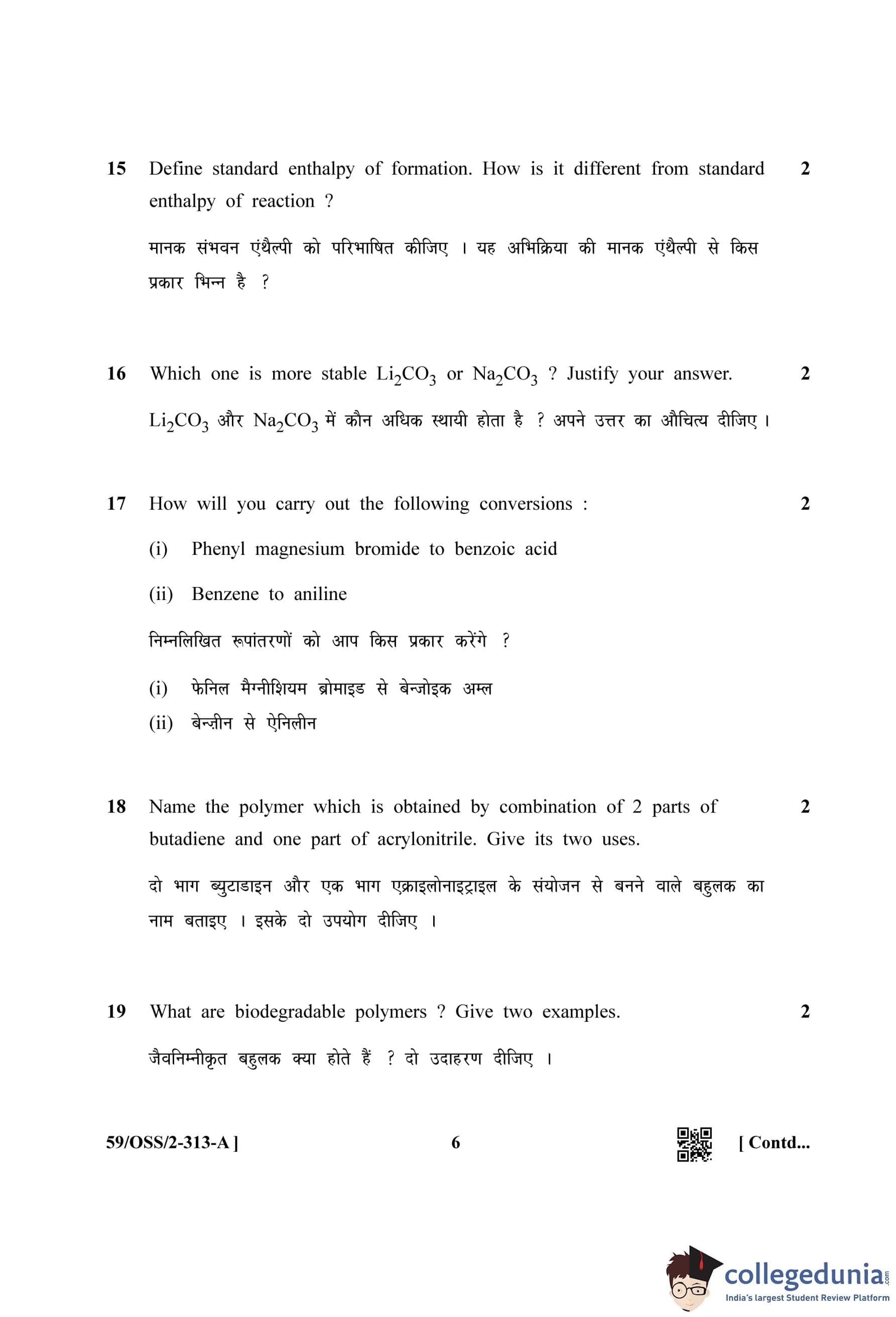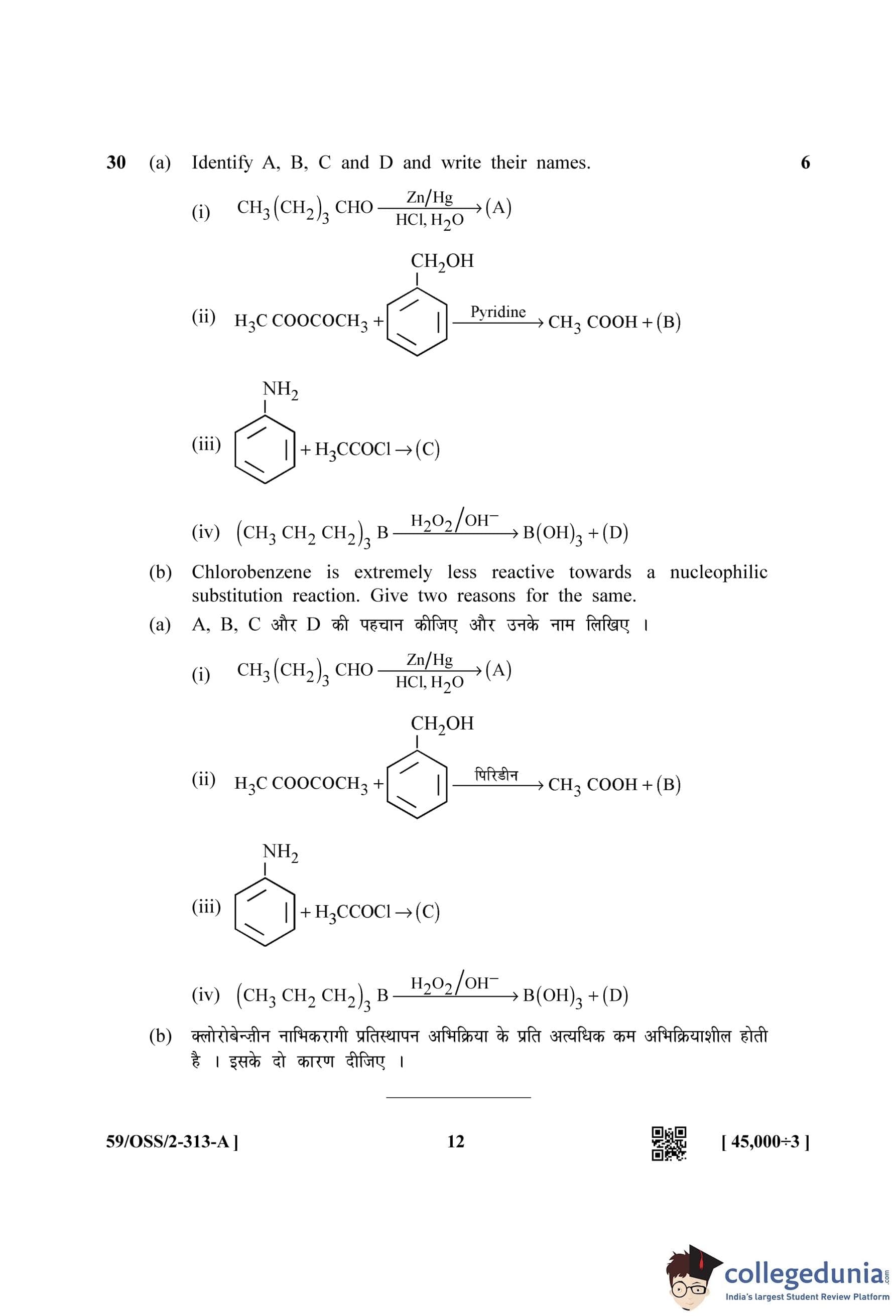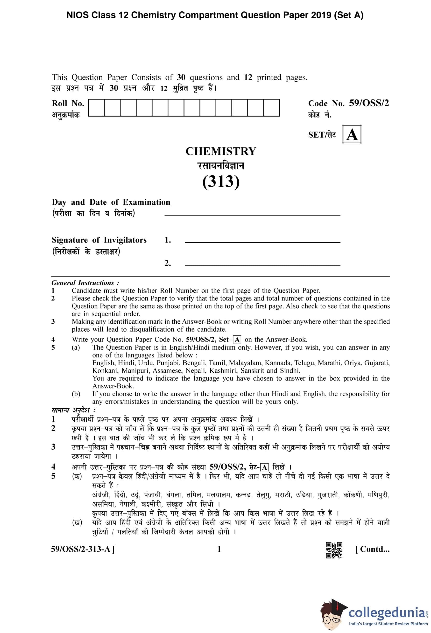 NIOS Class 12 Chemistry (Set A) Compartment Question Paper 2019 with Answer Key