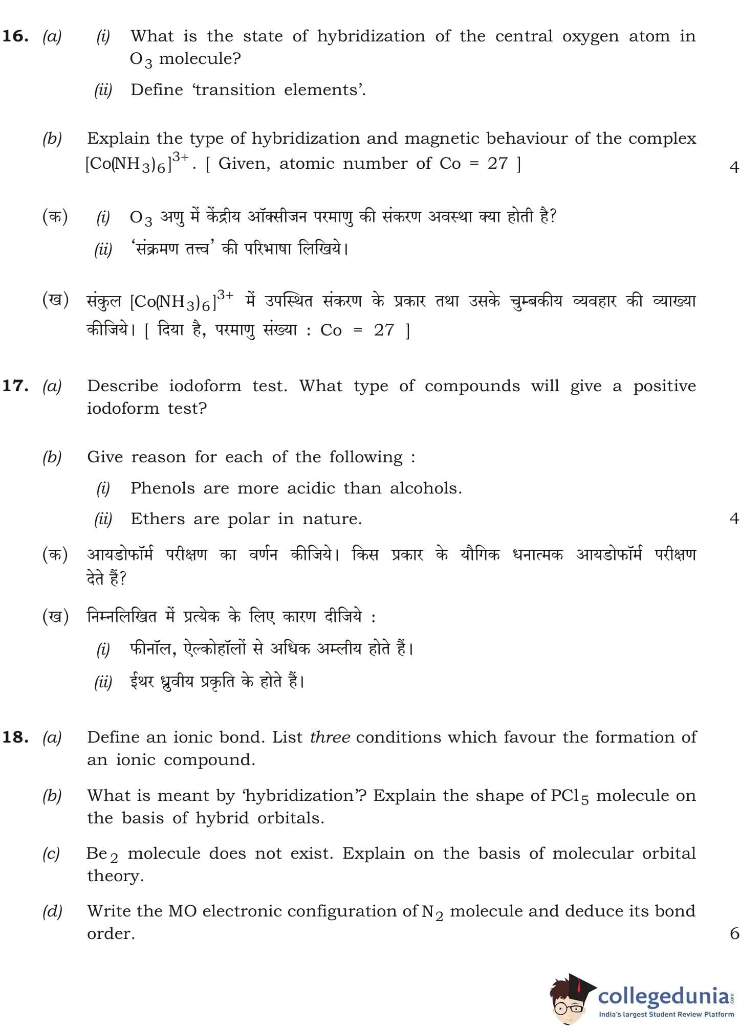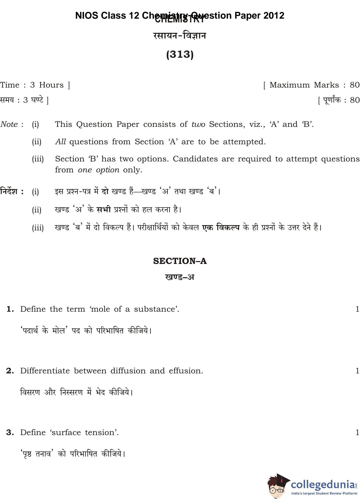NIOS Class 12 Chemistry Question Paper 2012 with Answer Key pdf is available for download here. The exam was conducted by National Institute of Open Schooling. The question paper comprised a total of 25 questions divided among 2 sections.