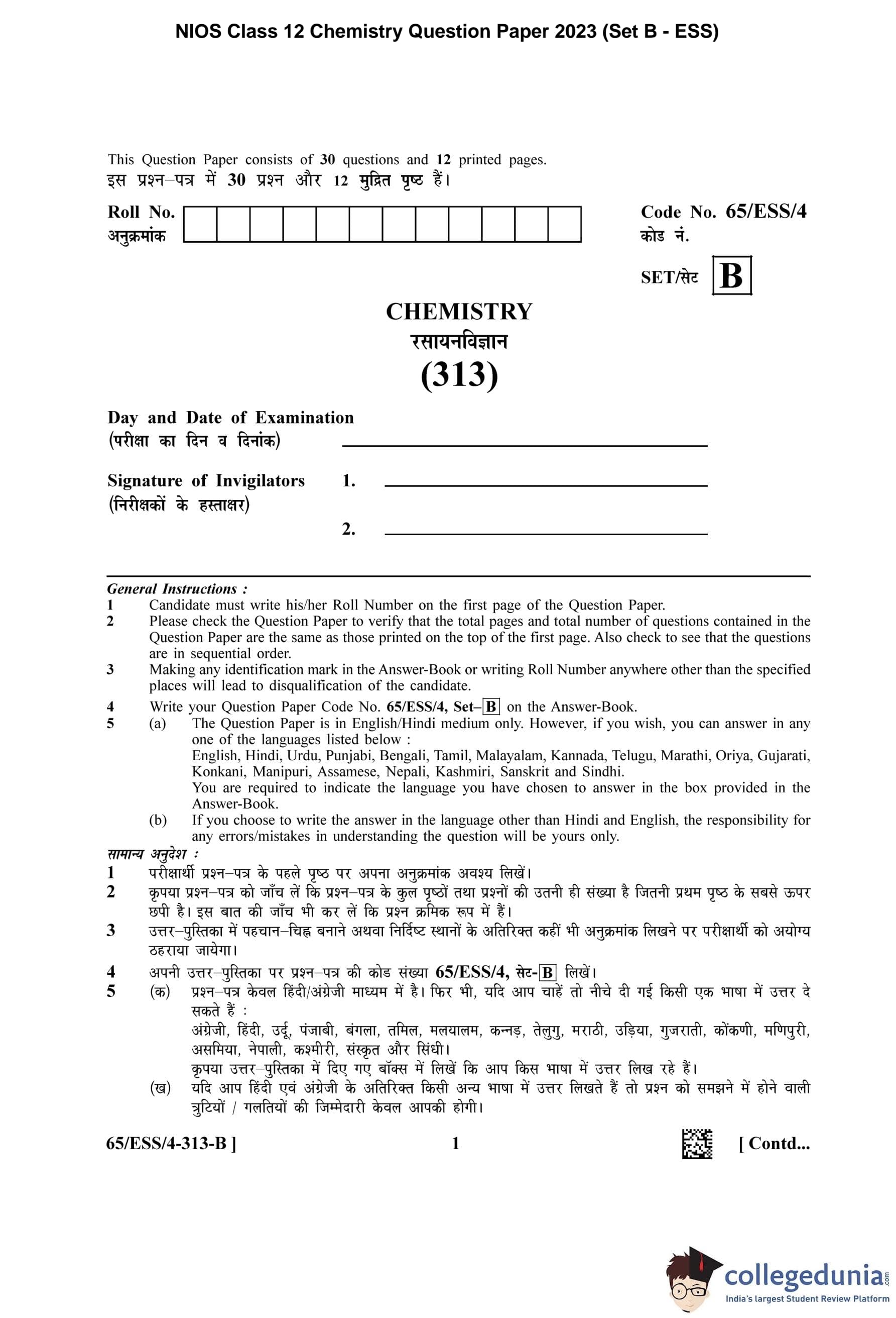 NIOS Class 12 Chemistry Question Paper 2023 with Answer Key pdf (Set B - ESS) is available for download here. The exam was conducted by National Institute of Open Schooling on April 19, 2023 in the Afternoon Session 2.30 PM to 5.30 PM. The question paper comprised a total of 30 questions.
