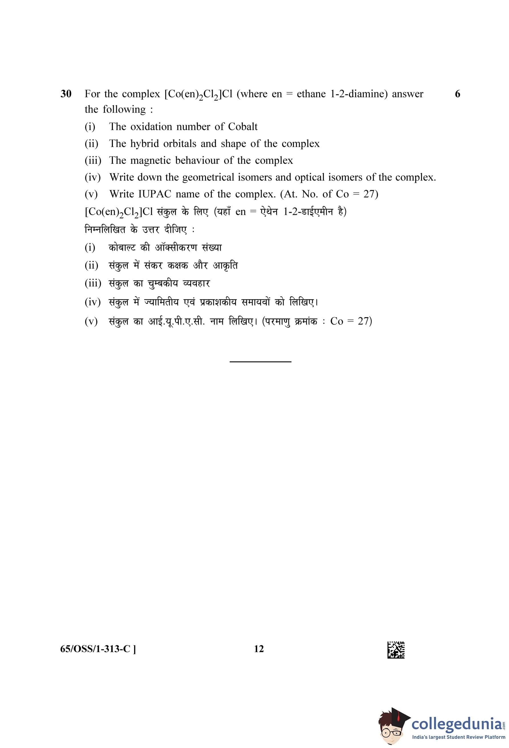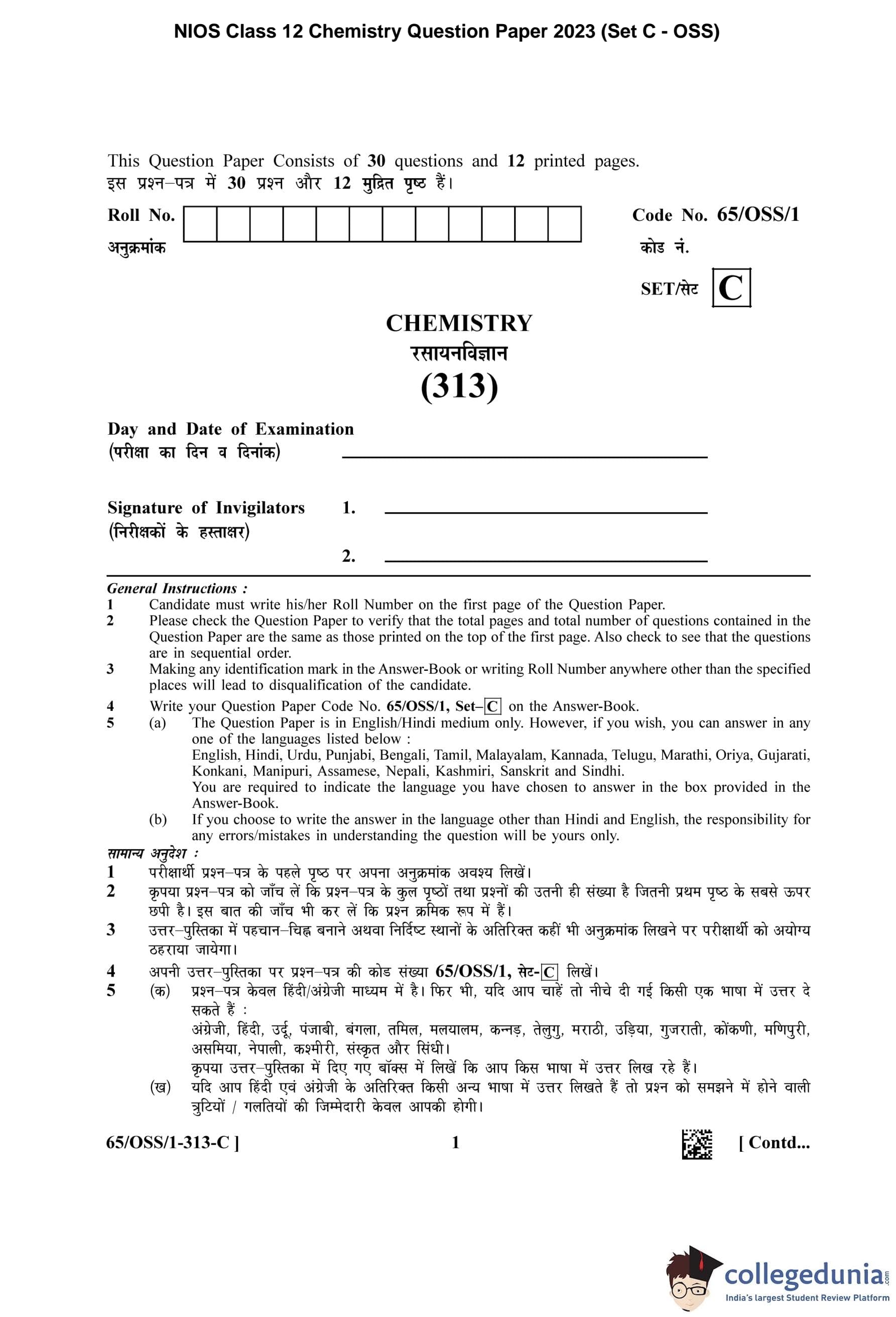 NIOS Class 12 Chemistry Question Paper 2023 with Answer Key pdf (Set C - OSS) is available for download here. The exam was conducted by National Institute of Open Schooling on April 19, 2023 in the Afternoon Session 2.30 PM to 5.30 PM. The question paper comprised a total of 30 questions.
