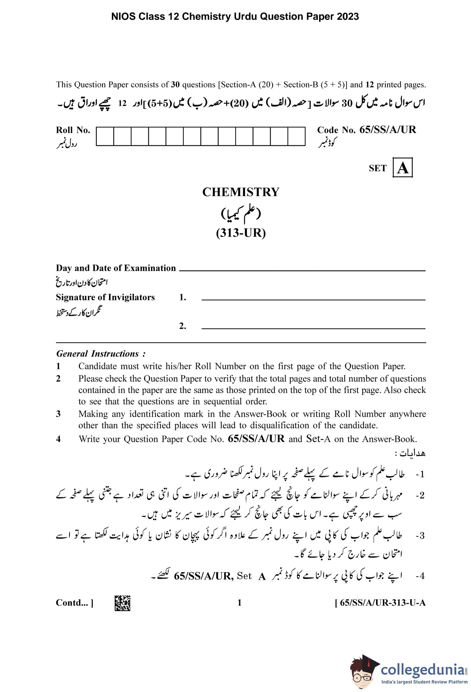 NIOS Class 12 Chemistry Urdu Question Paper 2023 with Answer Key pdf (Set A) is available for download here. The exam was conducted by National Institute of Open Schooling on April 19, 2023 in the Afternoon Session 2.30 PM to 5.30 PM. The question paper comprised a total of 30 questions divided among 2 sections.