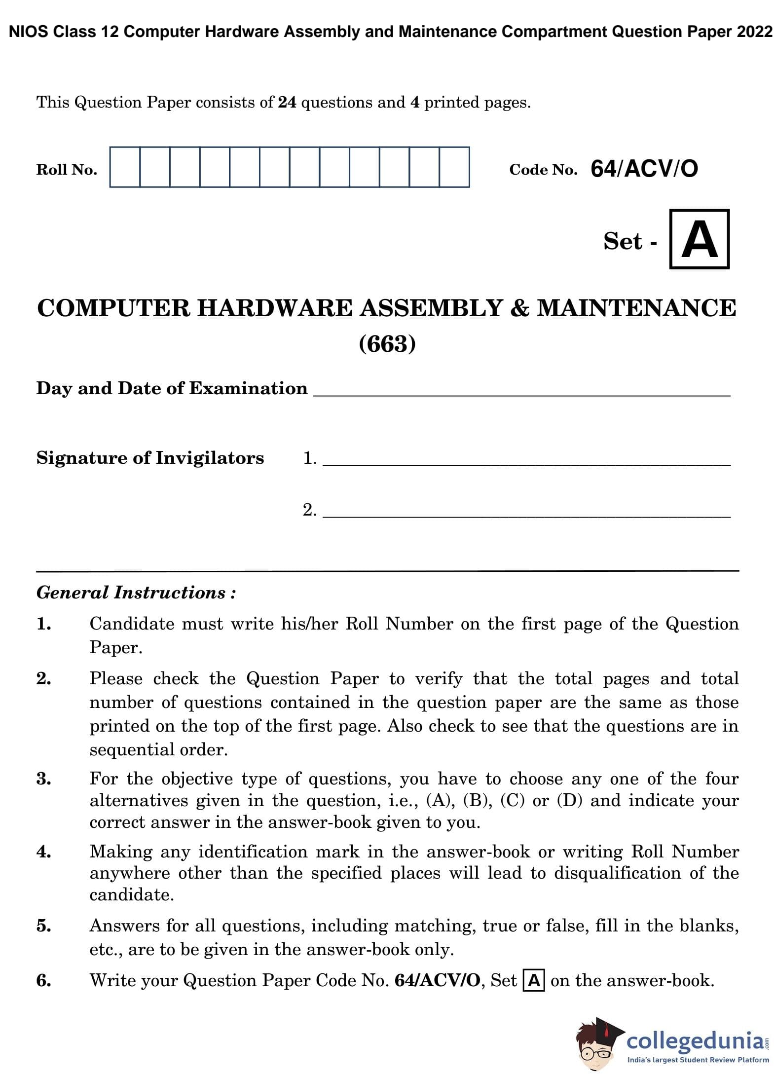 | NIOS Class 12 Computer Hardware Assembly and Maintenance Question Paper 2022 PDF | NIOS Class 12 Computer Hardware Assembly and Maintenance Answer Key 2022 PDF |