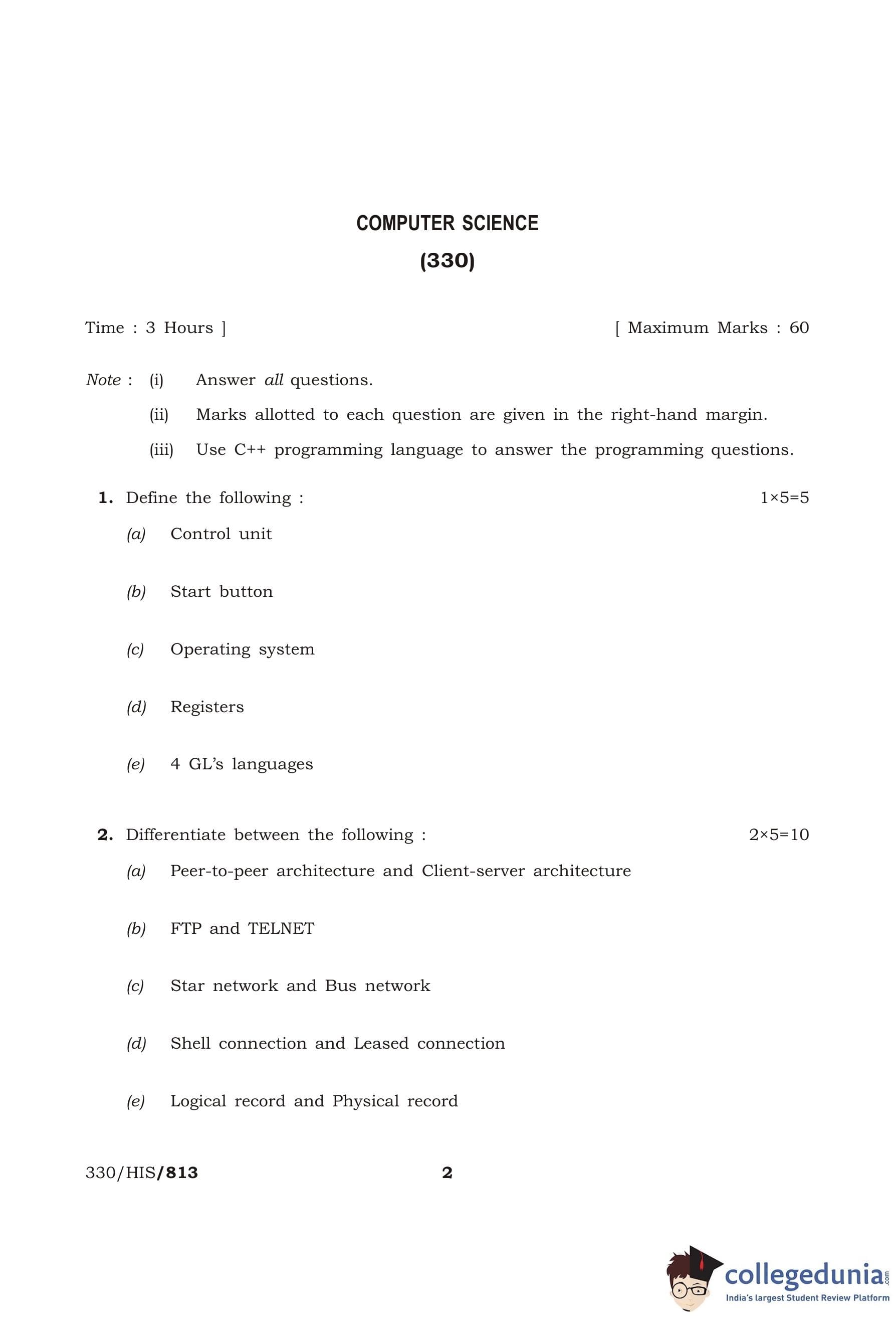 NIOS Class 12 Computer Science Compartment Question Paper 2016 with Answer Key
