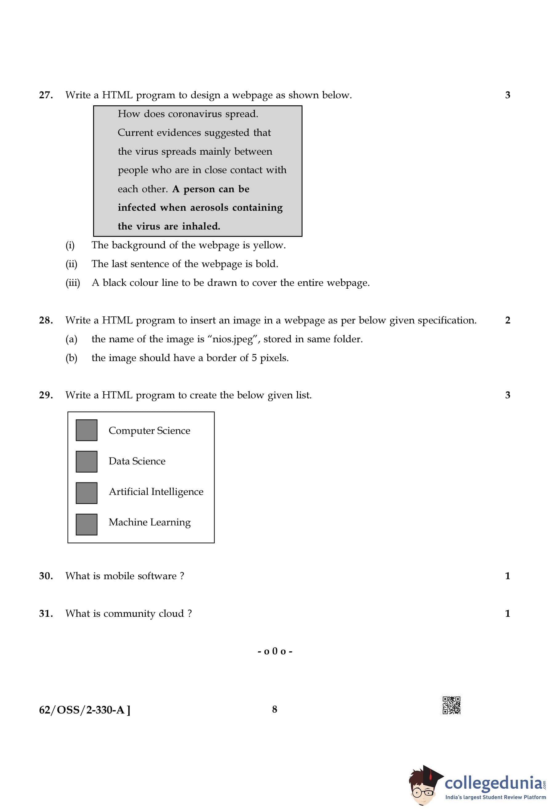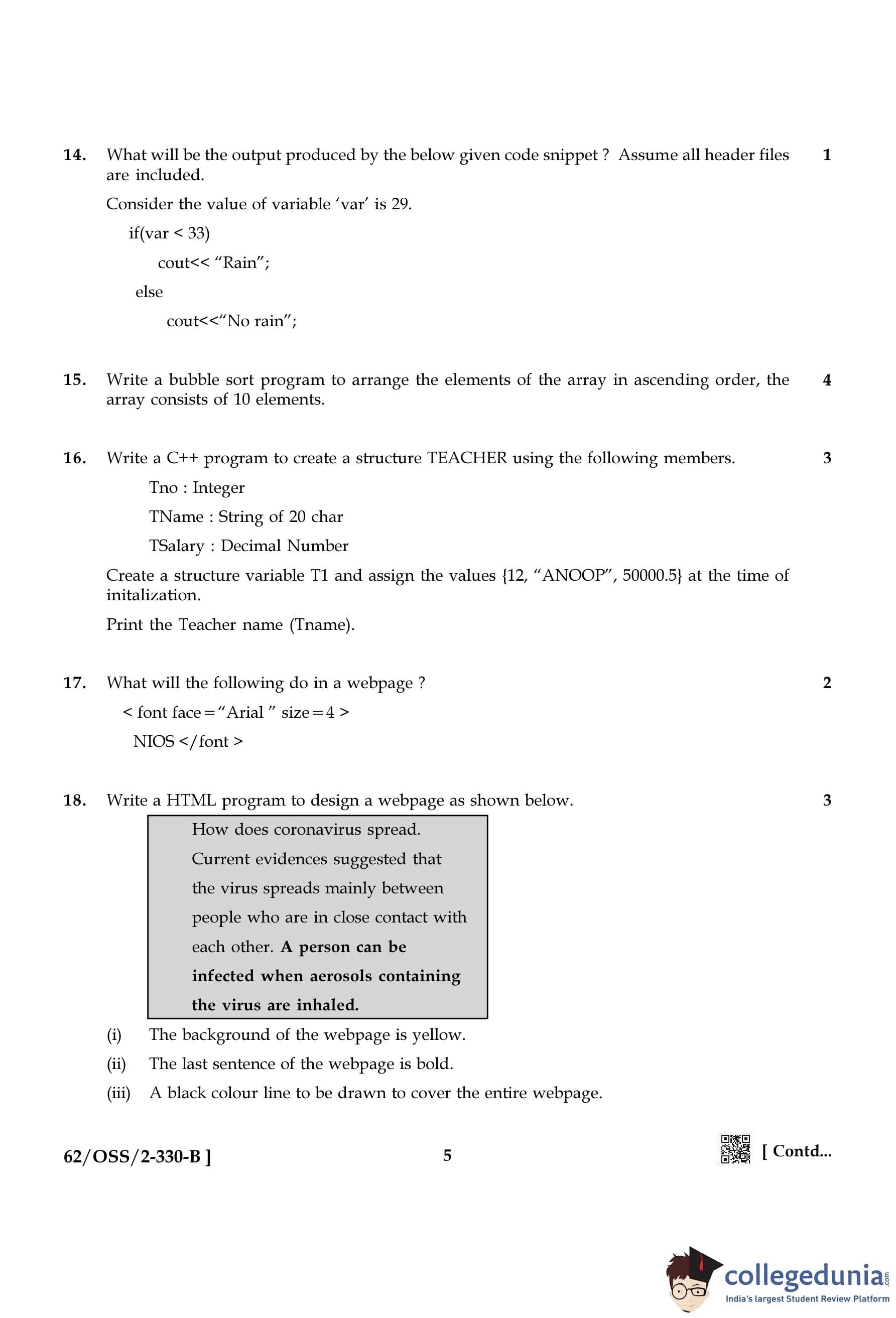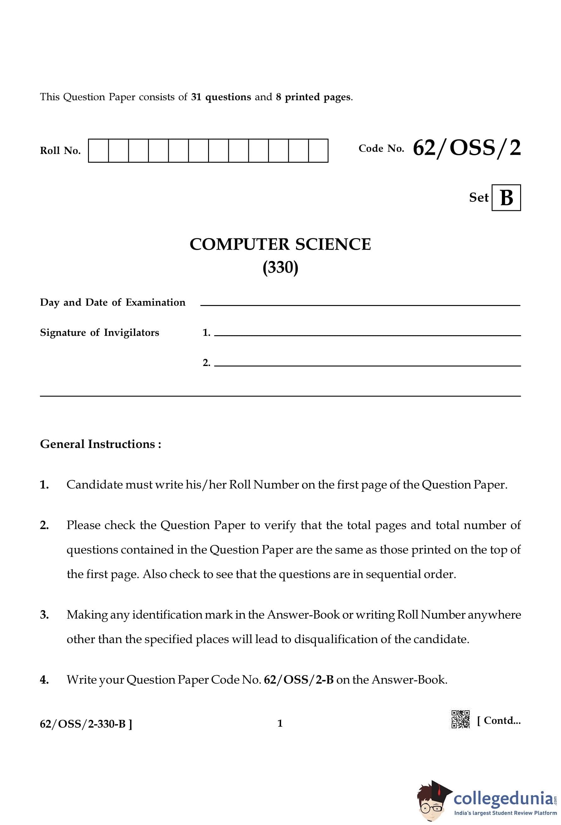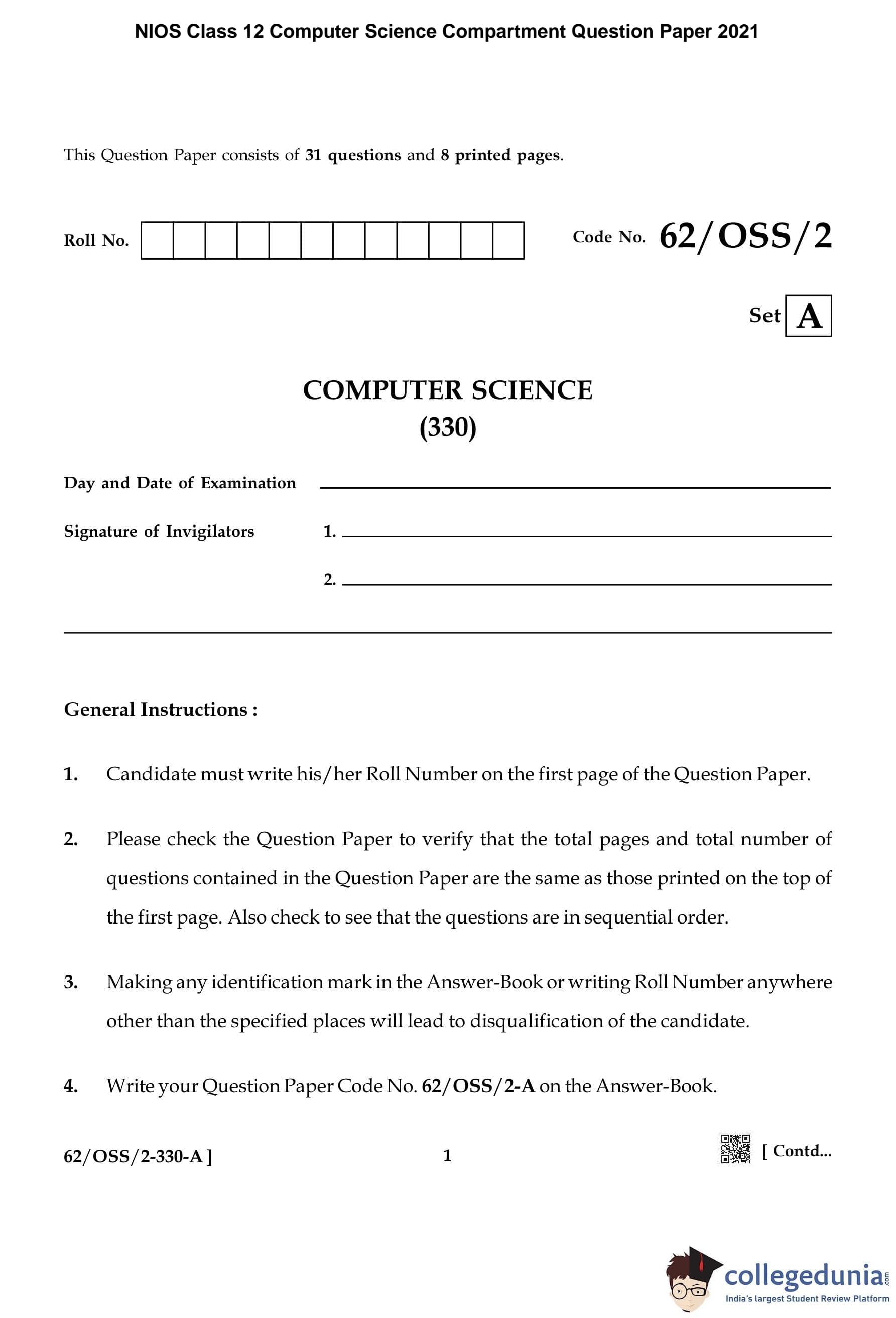 NIOS Class 12 Computer Science Compartment Question Paper 2021 with Answer Key pdf is available for download here. The exam was conducted by National Institute of Open Schooling on December 13, 2021 in the Afternoon Session 2:30 PM to 5:30 PM. The question paper comprised a total of 31 questions.