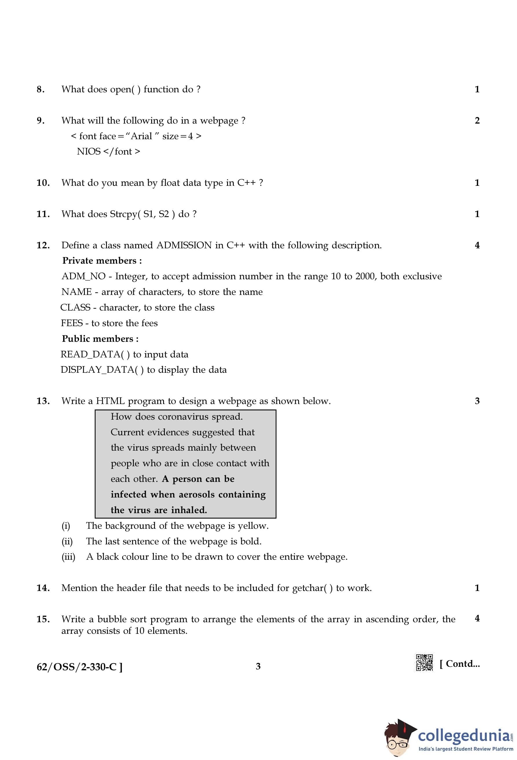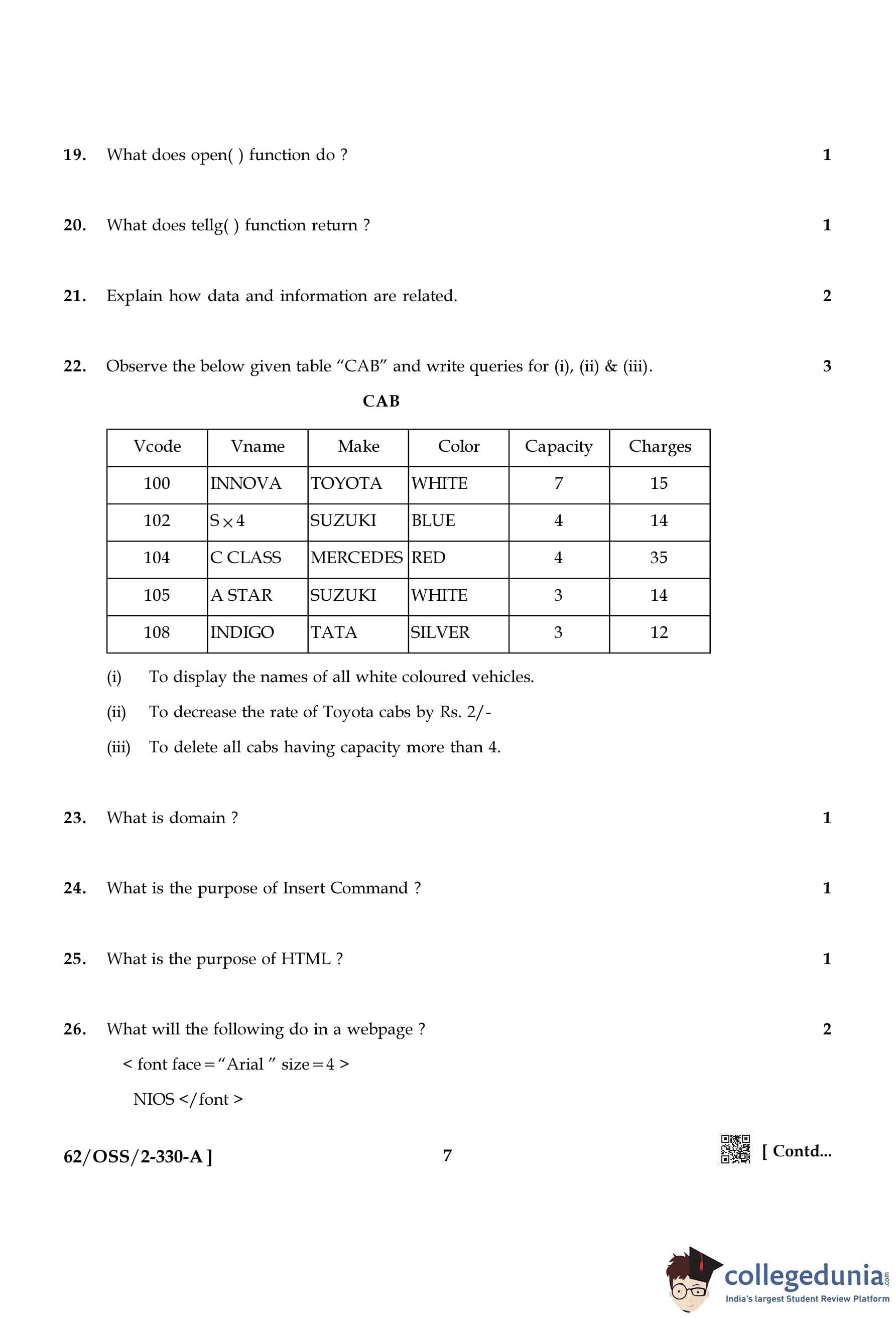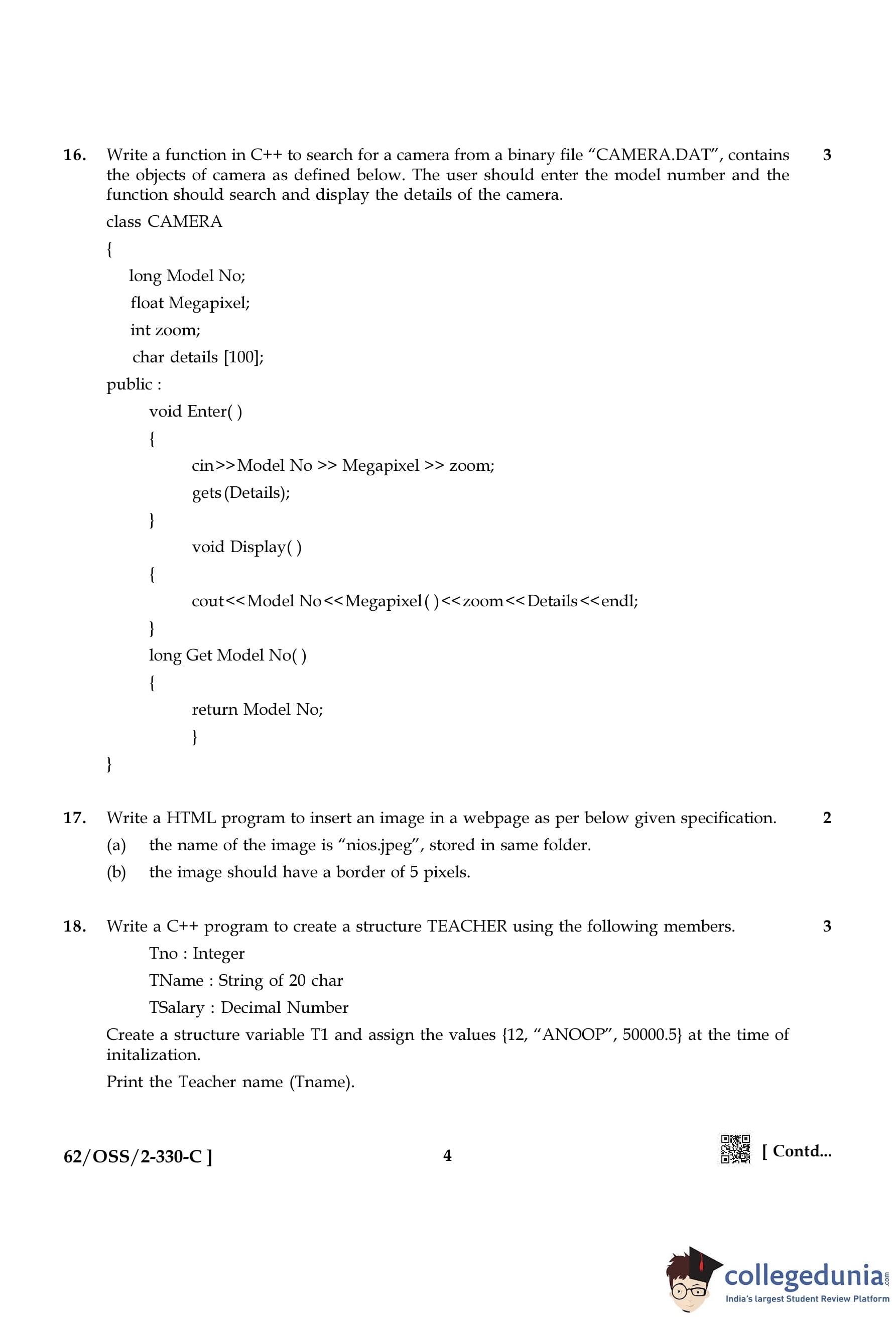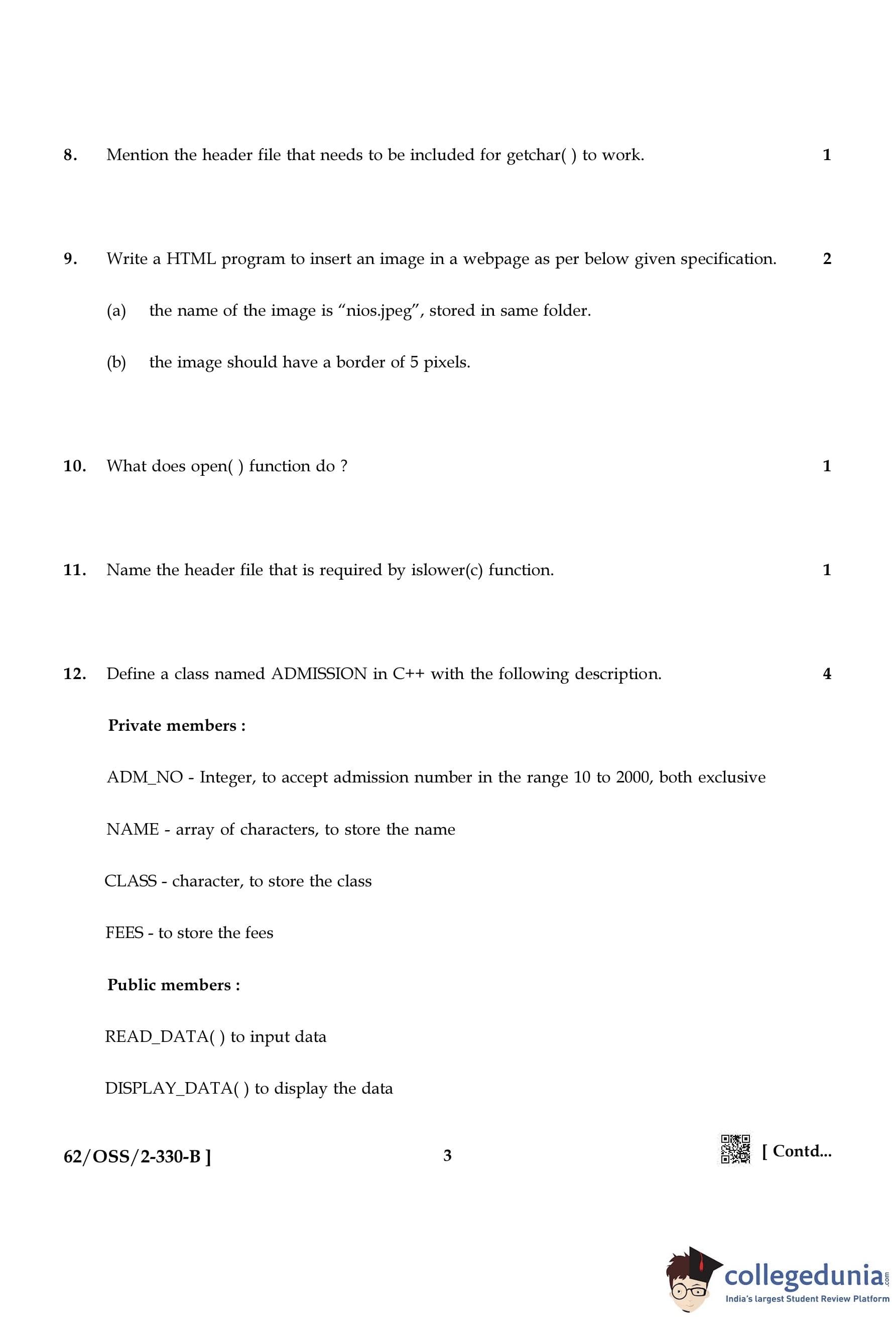 NIOS Class 12 Computer Science Compartment Question Paper 2021 with Answer Key