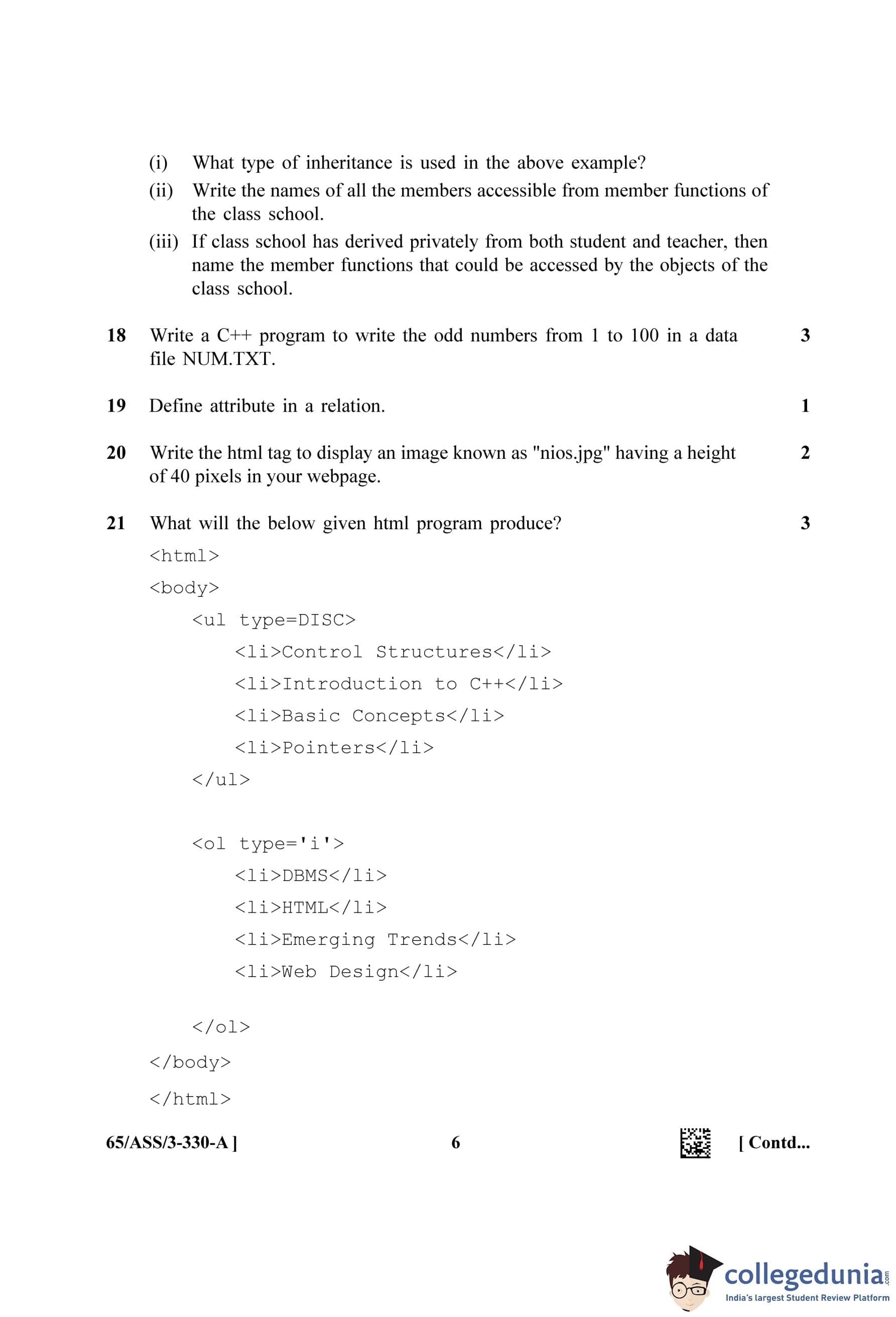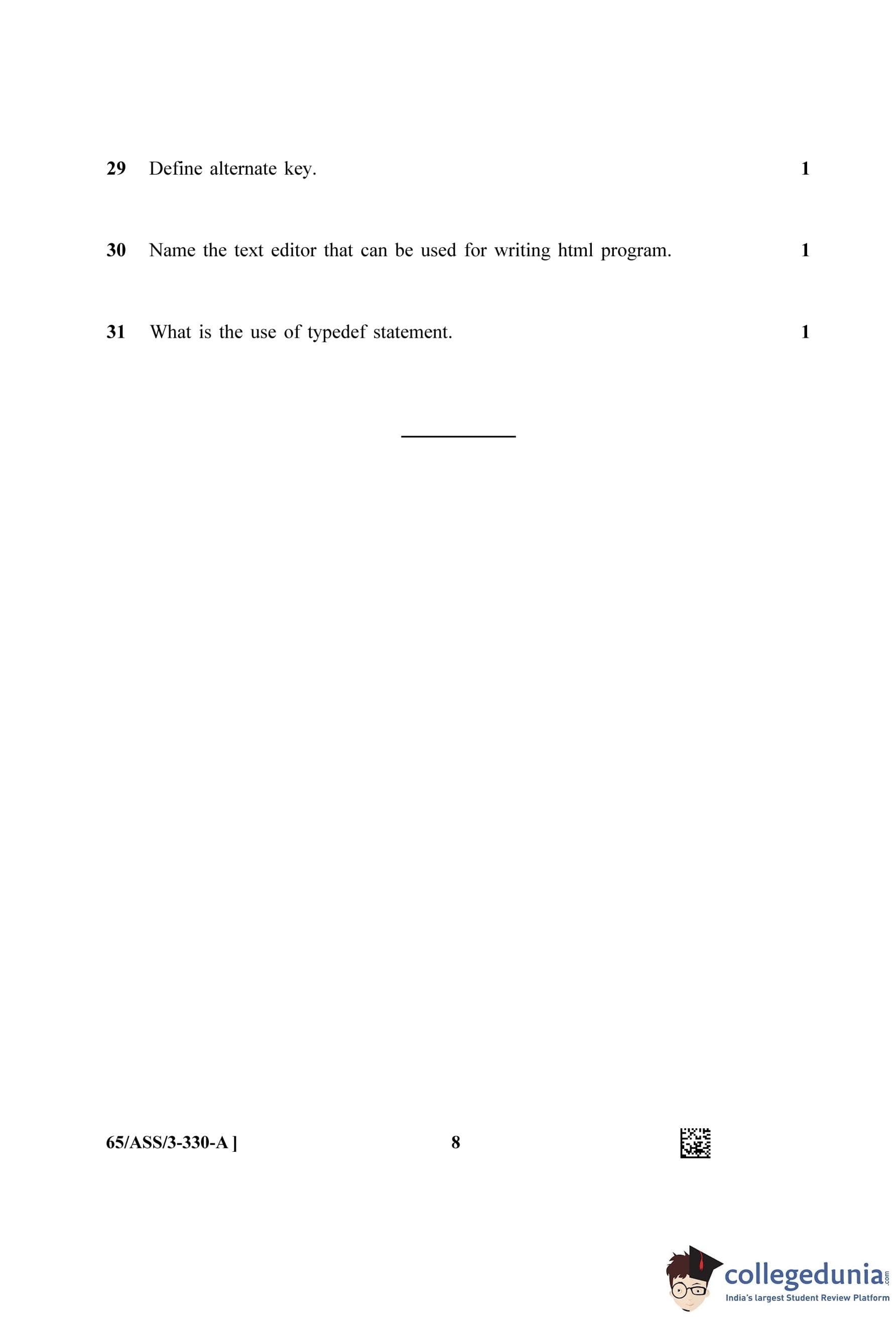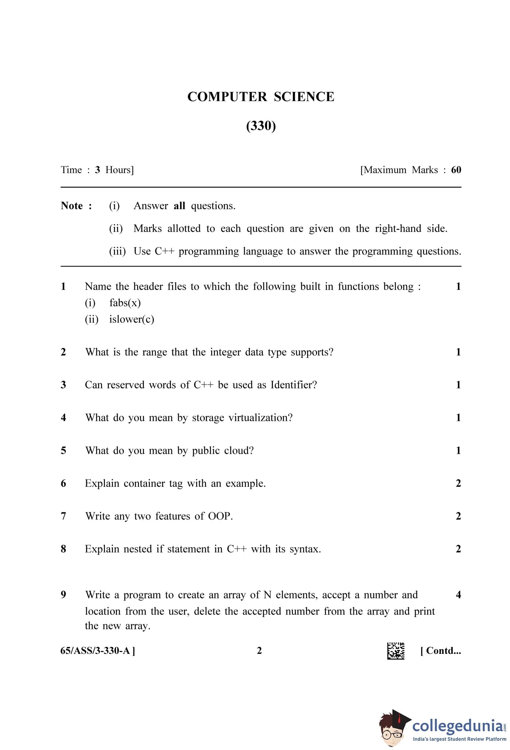 NIOS Class 12 Computer Science Question Paper 2023 with Answer Key (Set A - ASS)