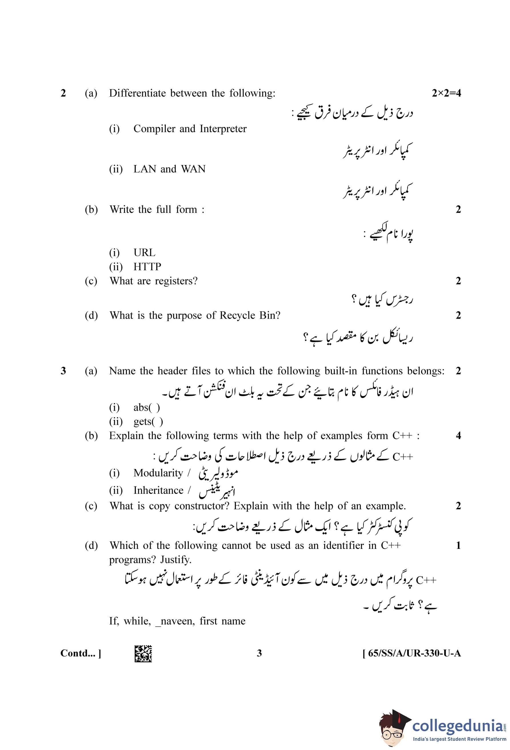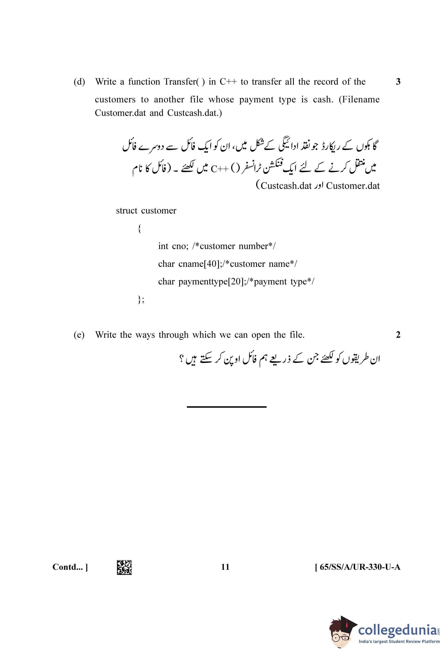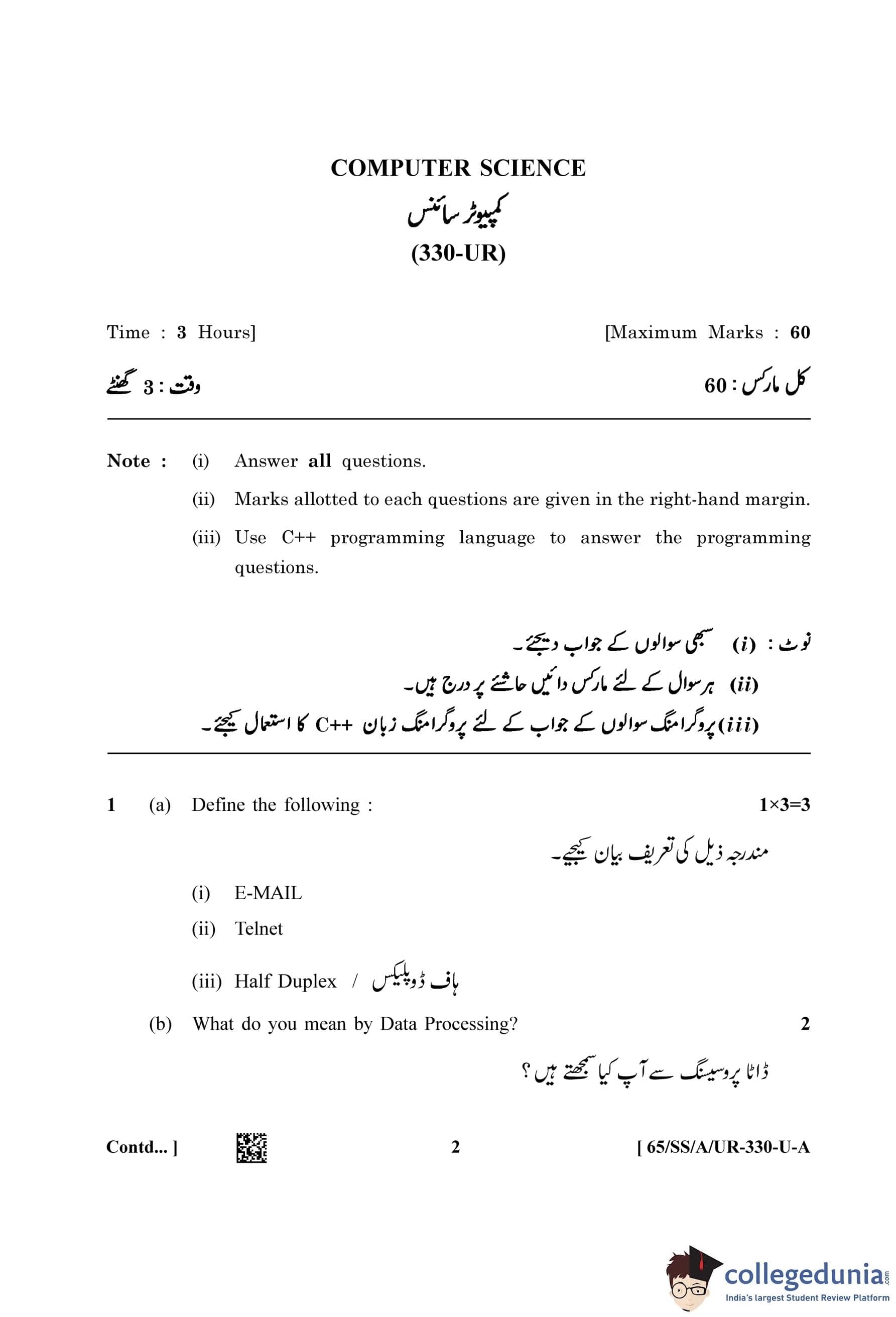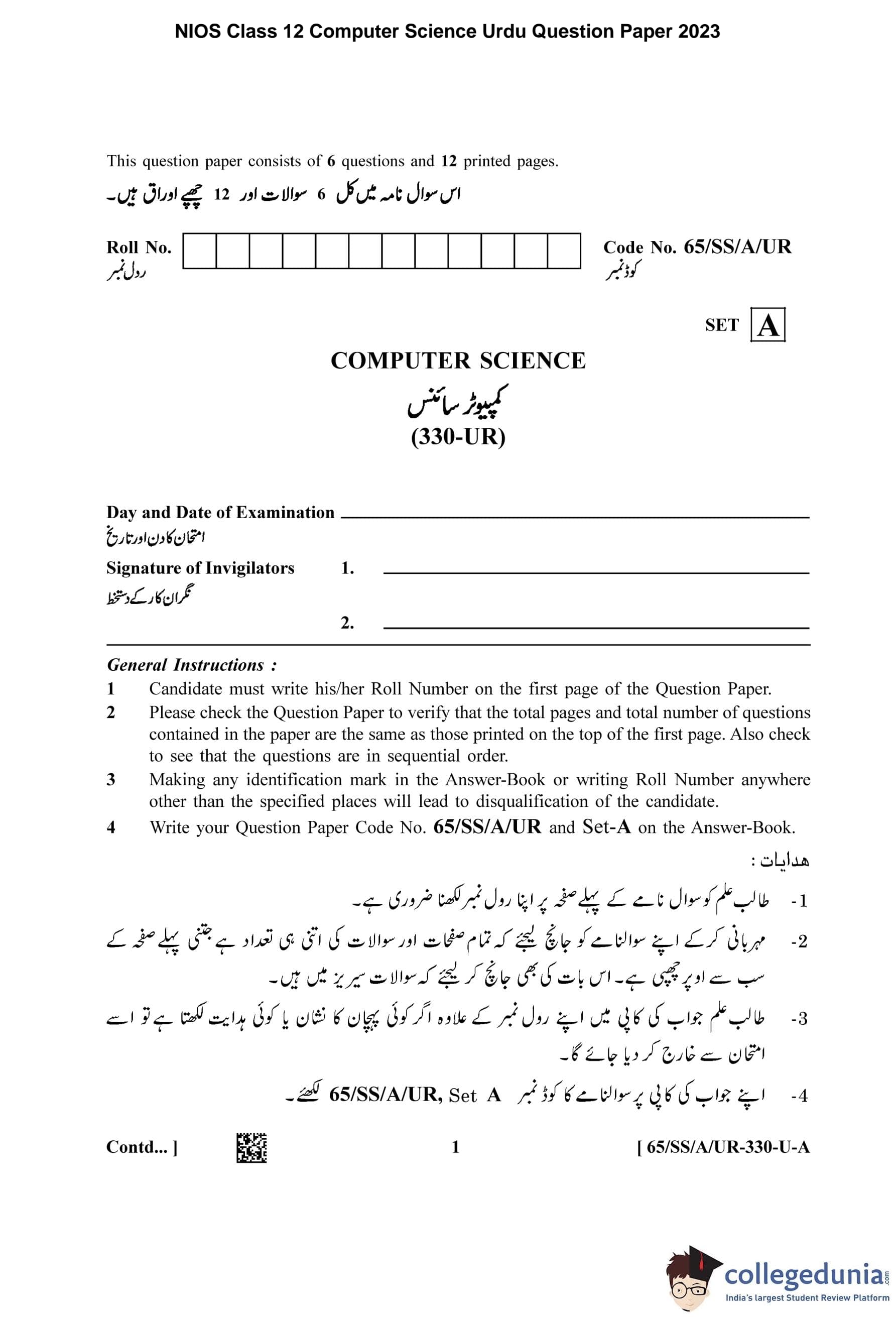 NIOS Class 12 Computer Science Urdu (Set A) Question Paper 2023 with Answer Key