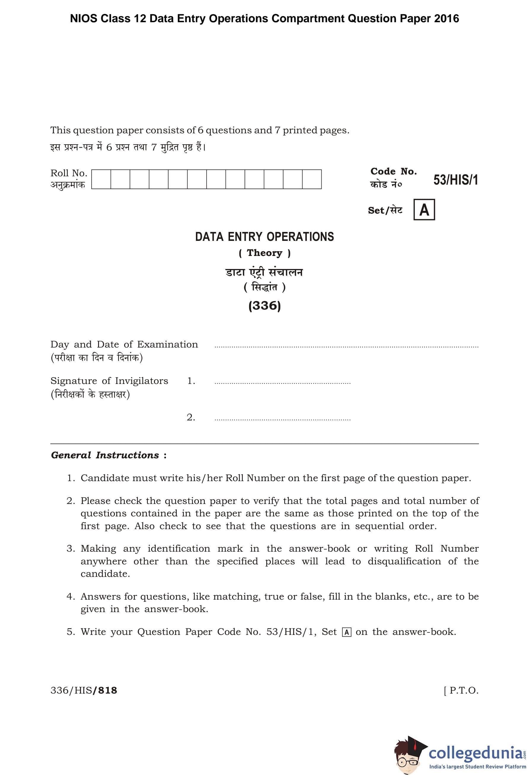 NIOS Class 12 Data Entry Operations Compartment Question Paper 2016 with Answer Key