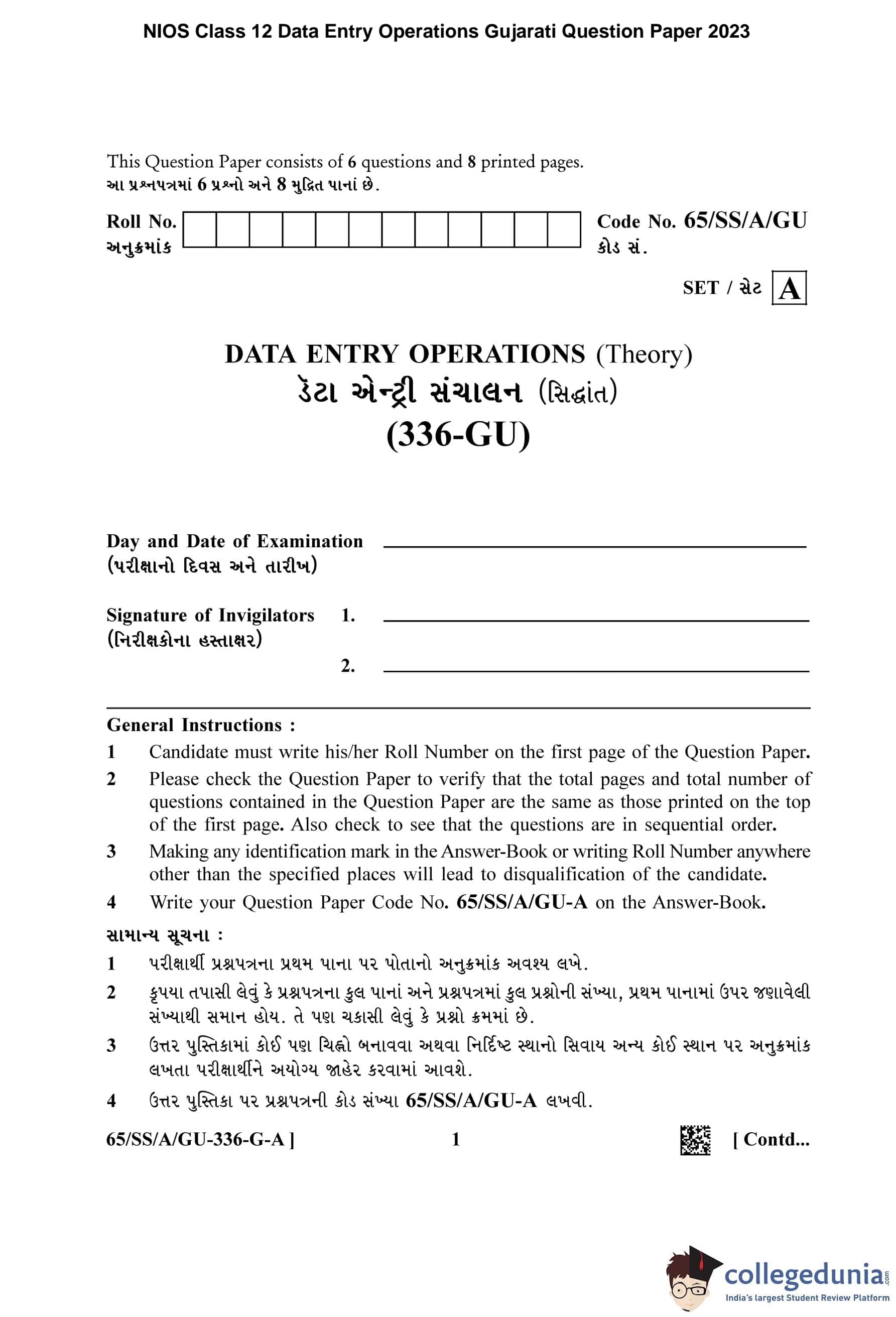 NIOS Class 12 Data Entry Operations Gujarati Question Paper 2023 with Answer Key pdf (Set A) is available for download here. The exam was conducted by National Institute of Open Schooling on May 3, 2023 in the Afternoon Session 2.30 PM to 4.30 PM. The question paper comprised a total of 6 questions.