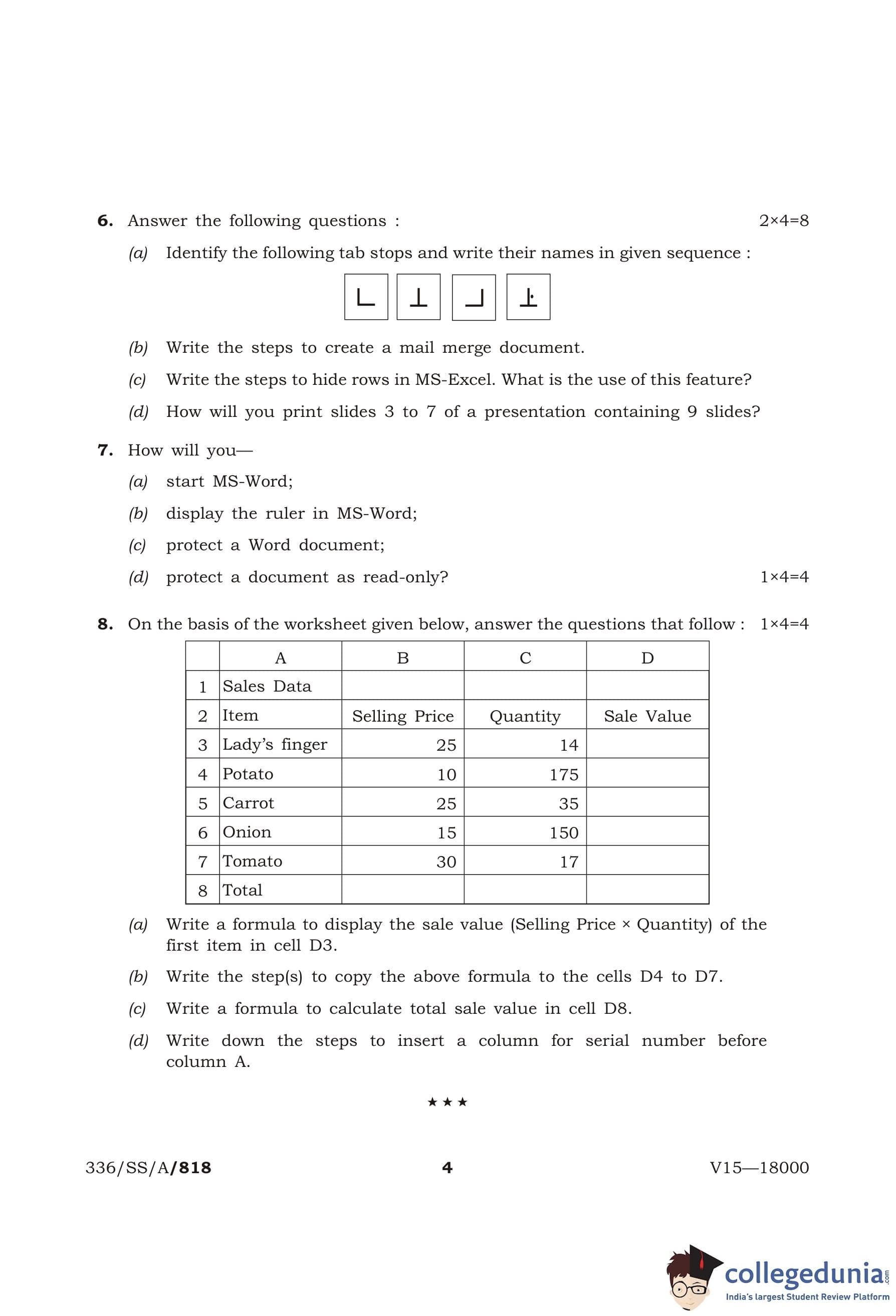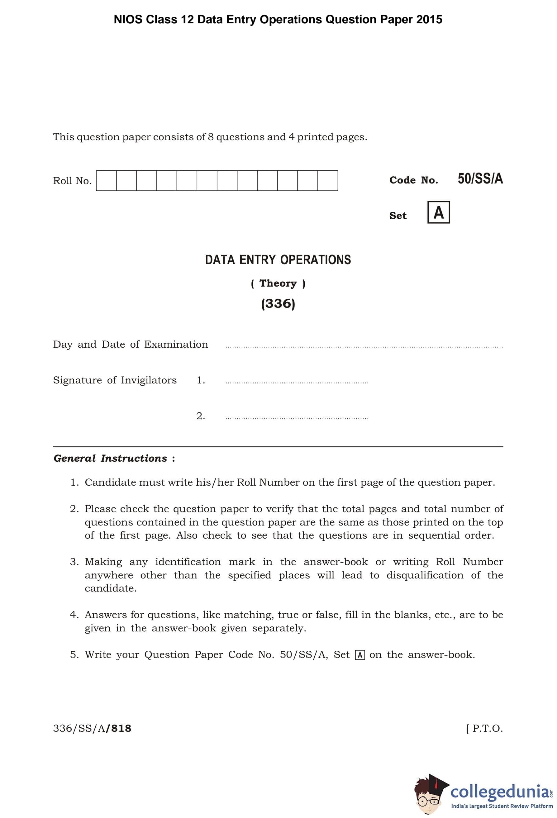 NIOS Class 12 Data Entry Operations Question Paper 2015 with Answer Key