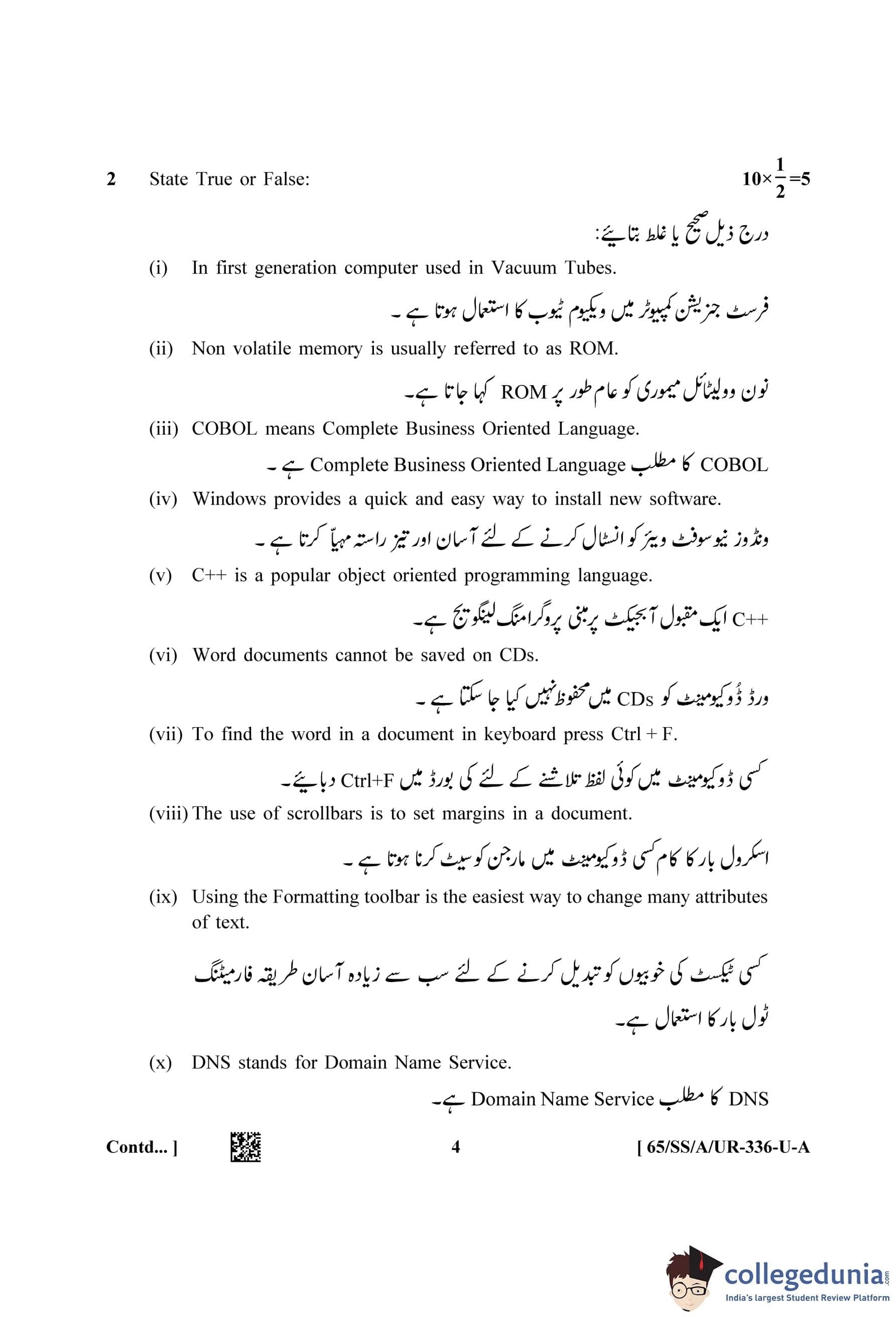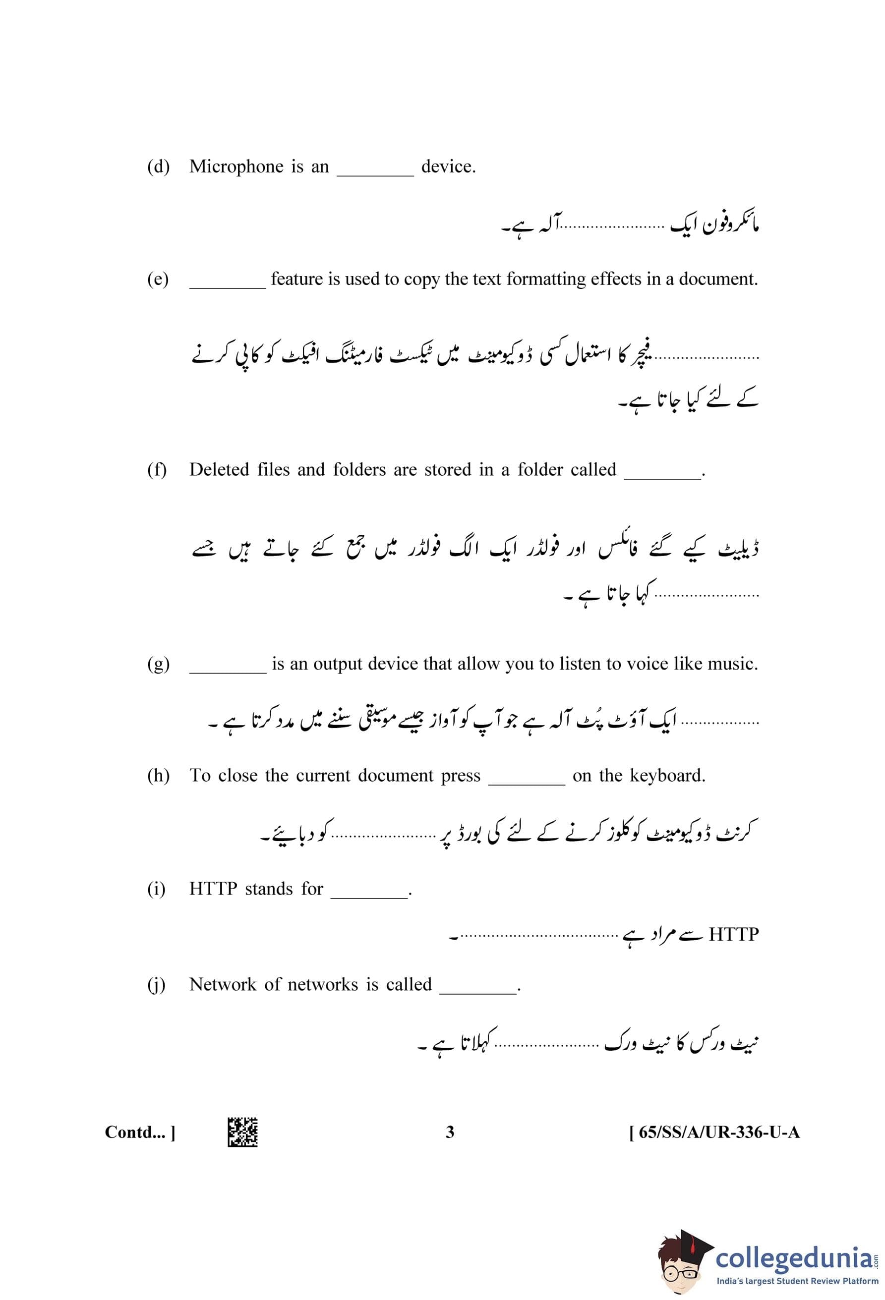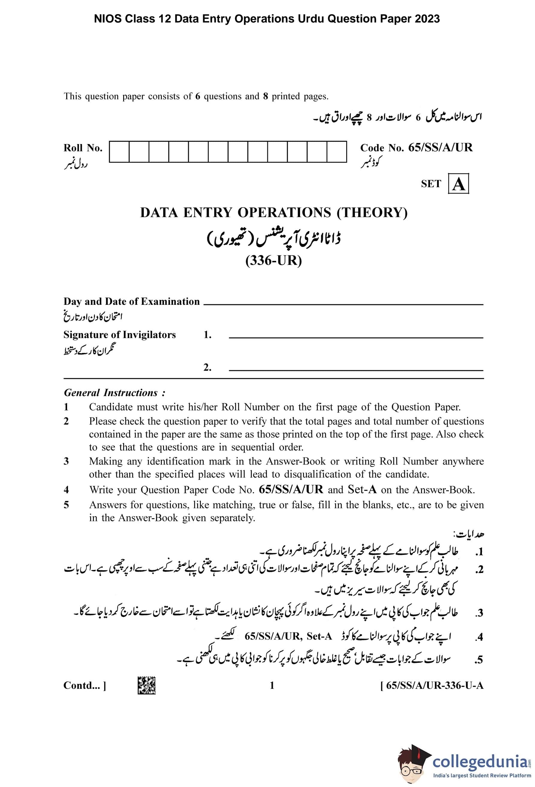 NIOS Class 12 Data Entry Operations Urdu (Set A) Question Paper 2023 with Answer Key