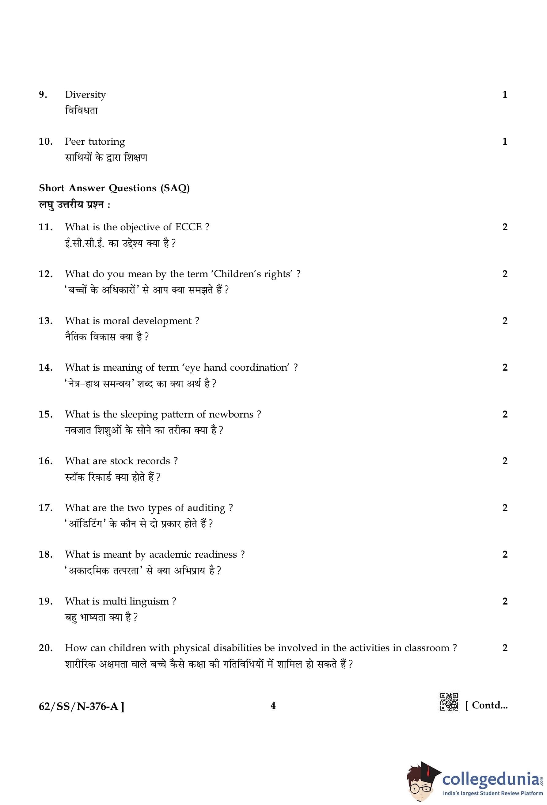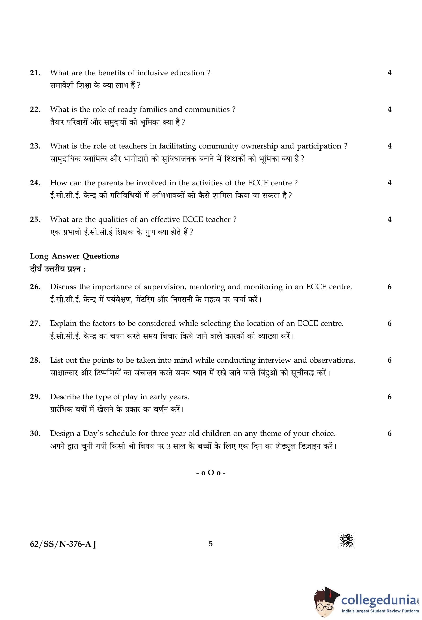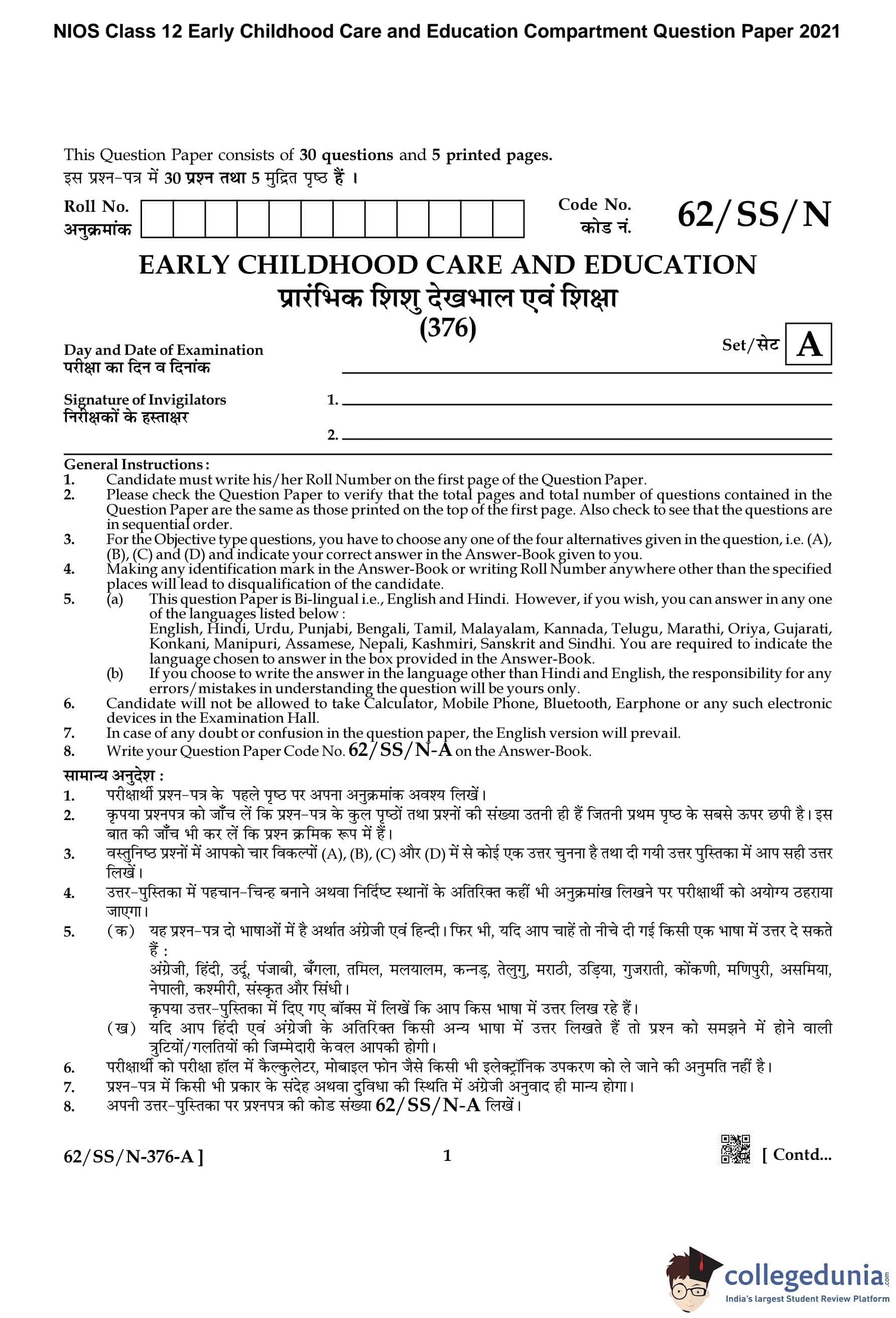 NIOS Class 12 Early Childhood Care and Education Compartment Question Paper 2021 with Answer Key pdf is available for download here. The exam was conducted by National Institute of Open Schooling on November 12, 2021 in the Afternoon Session 2:30 PM to 5:30 PM. The question paper comprised a total of 30 questions.