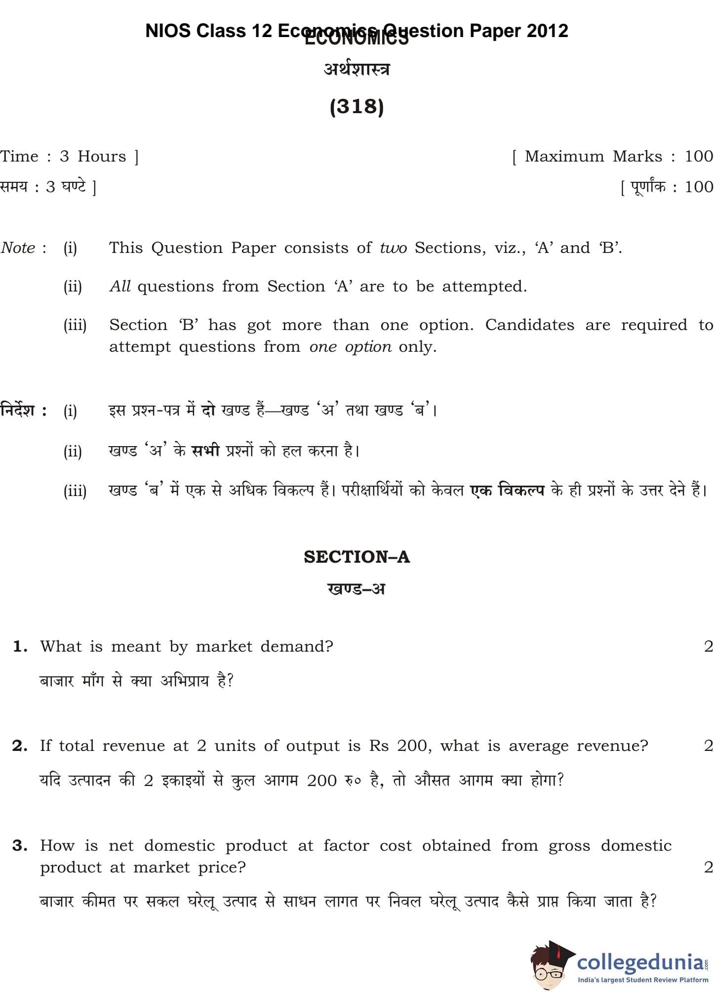 NIOS Class 12 Economics Question Paper 2012 with Answer Key pdf is available for download here. The exam was conducted by National Institute of Open Schooling. The question paper comprised a total of 23 questions divided among 2 sections.