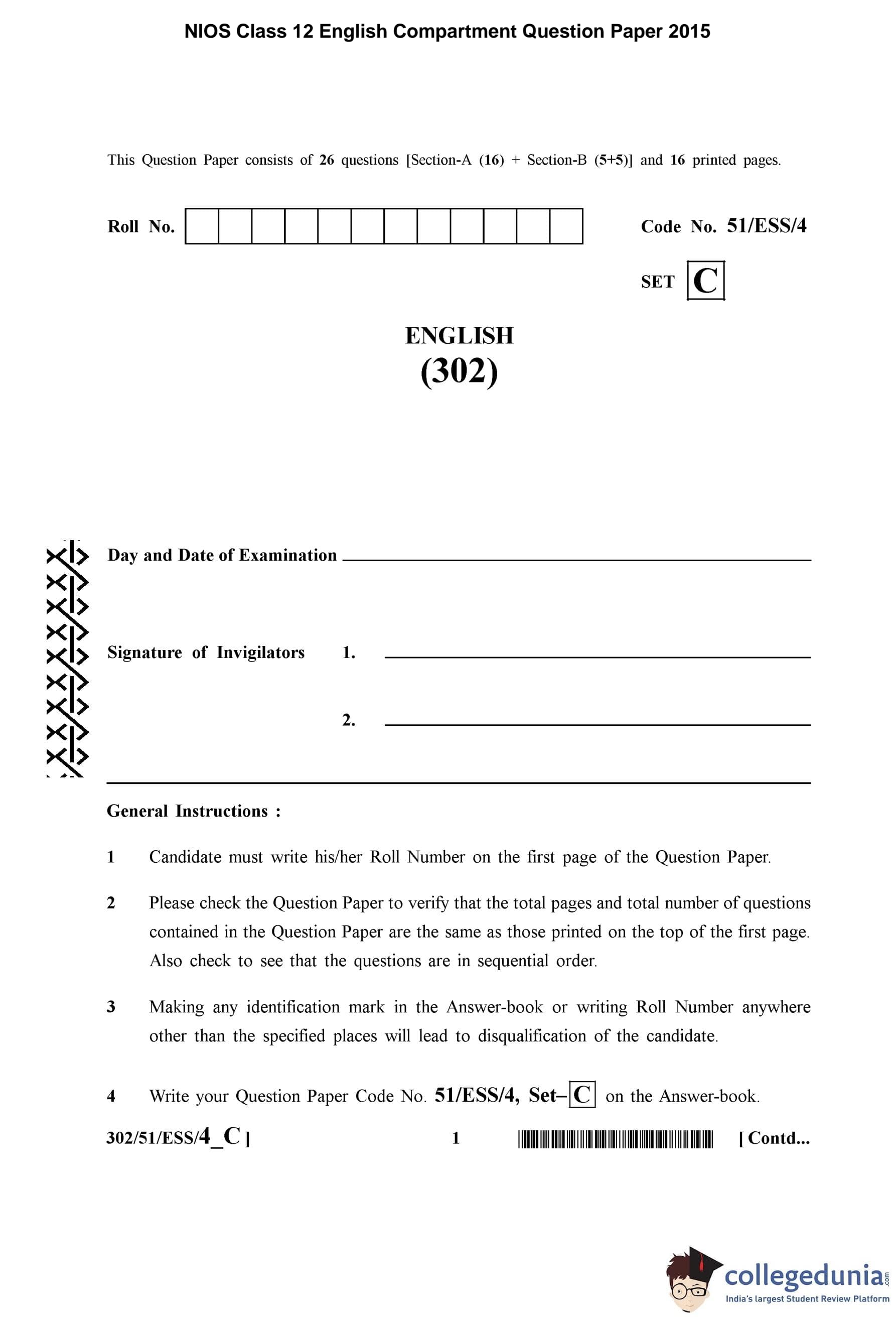 | NIOS Class 12 English Question Paper 2015 PDF | NIOS Class 12 English Answer Key 2015 PDF |